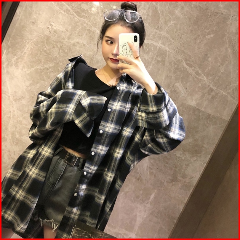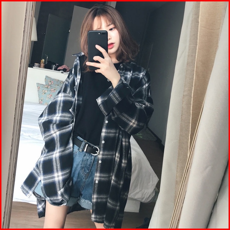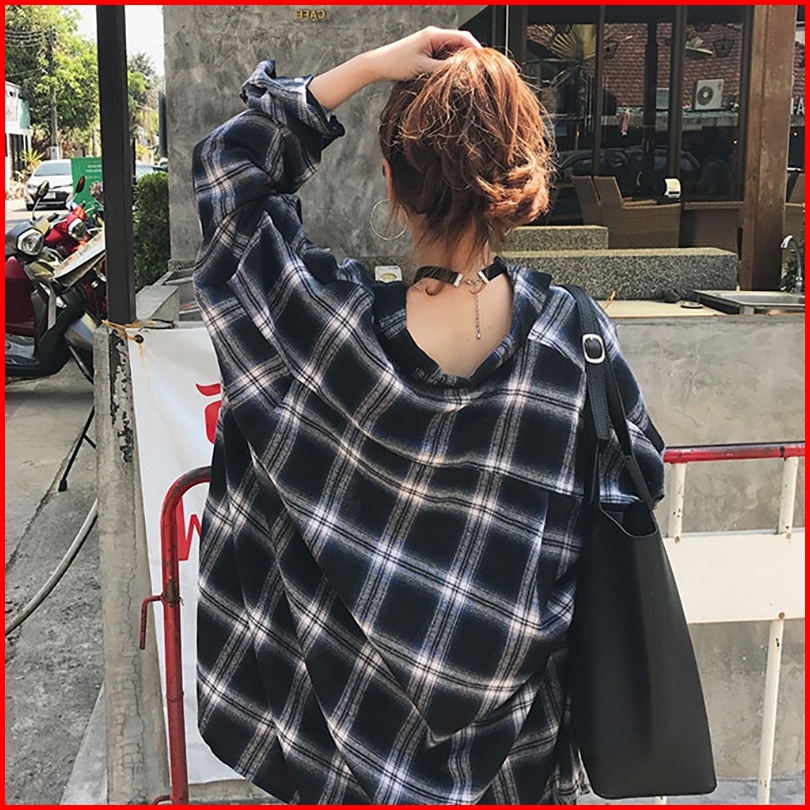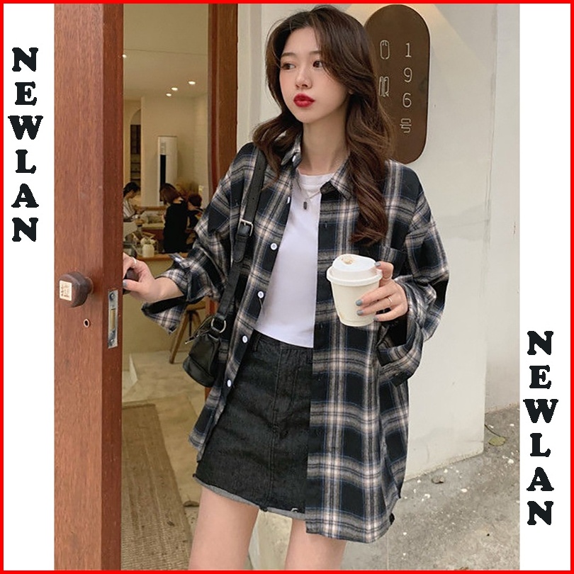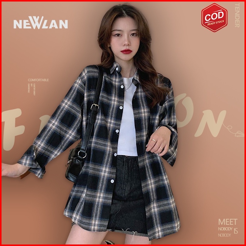 Newlan Cs004 Kemeja Wanita Casual Lengan Panjang Model Longgar Versi Korea Motif Kemeja Kotak Kotak Flanel Oversize