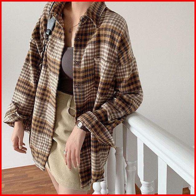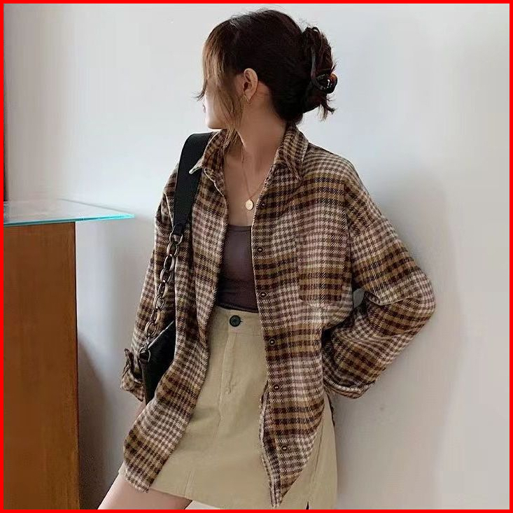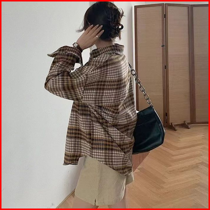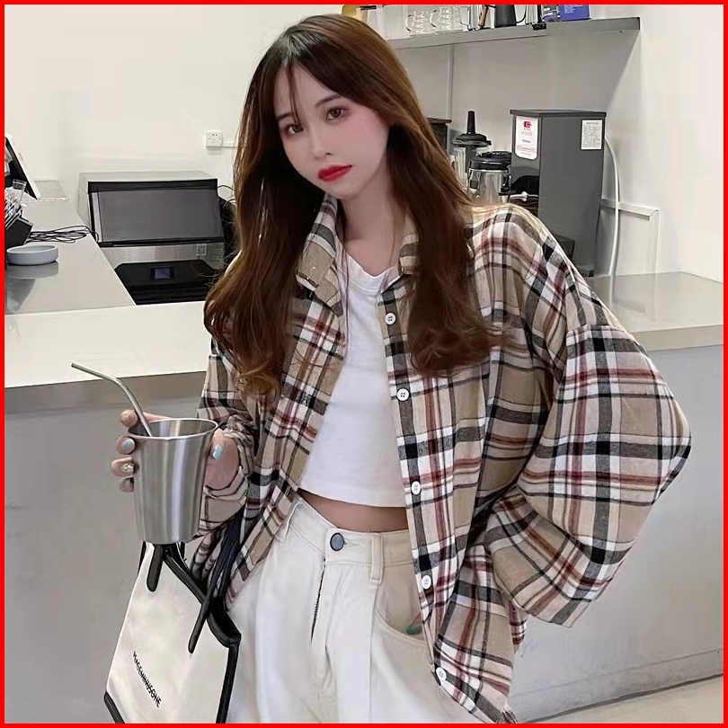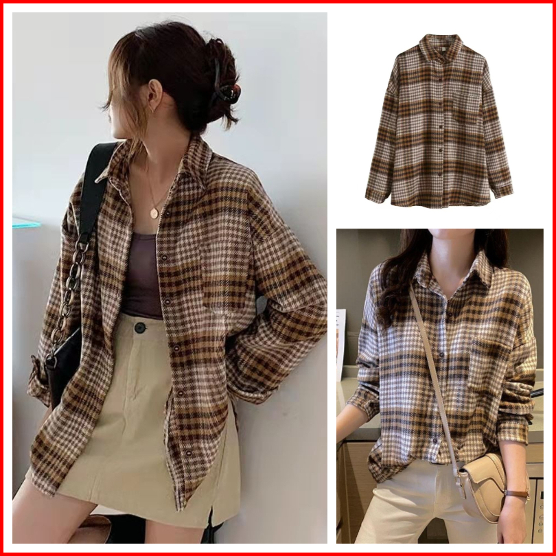 Kemeja Flannel Wanita Oversize Outer Kemeja Lengan Panjang Wanita Blouse Kotak Kotak