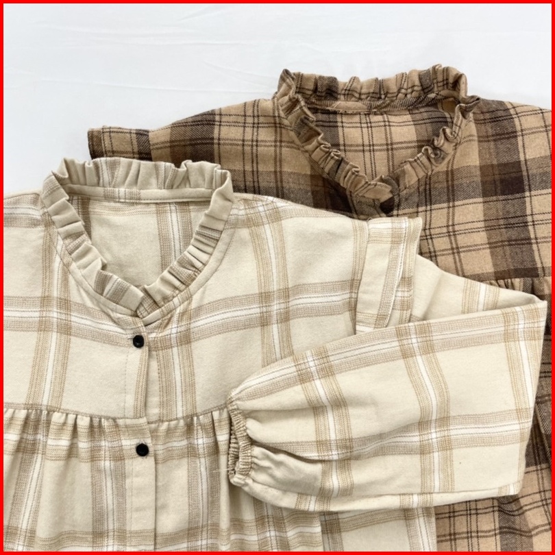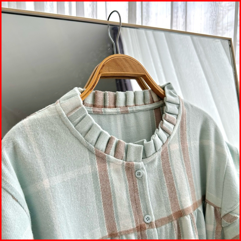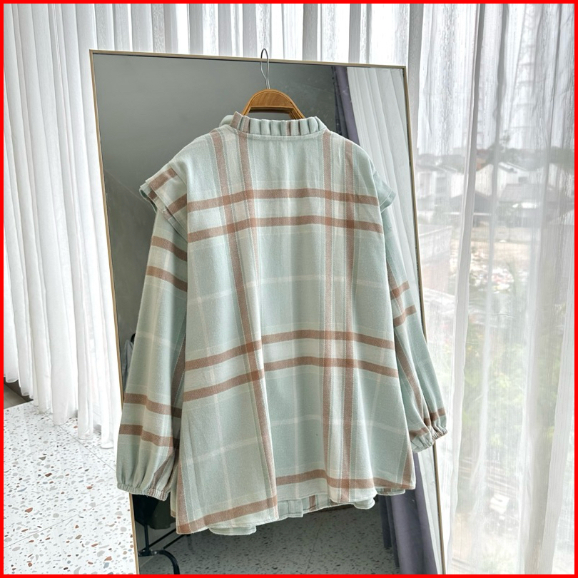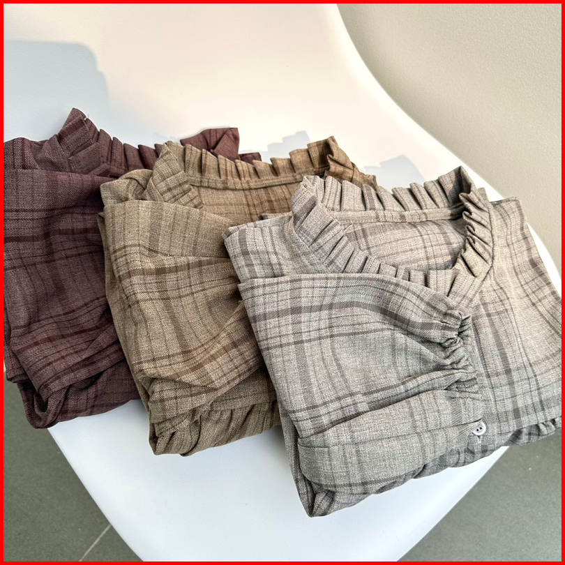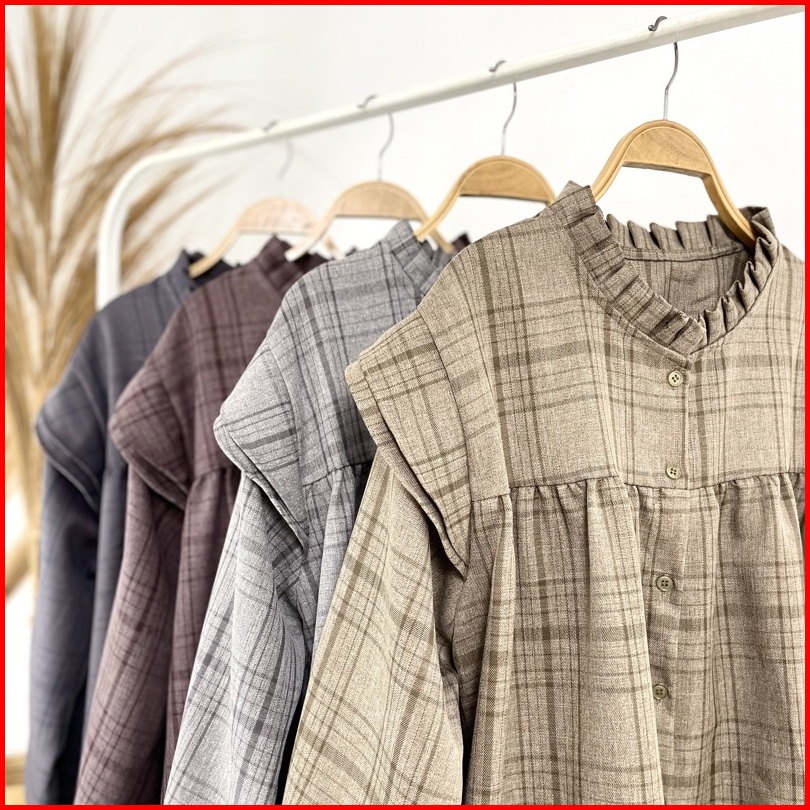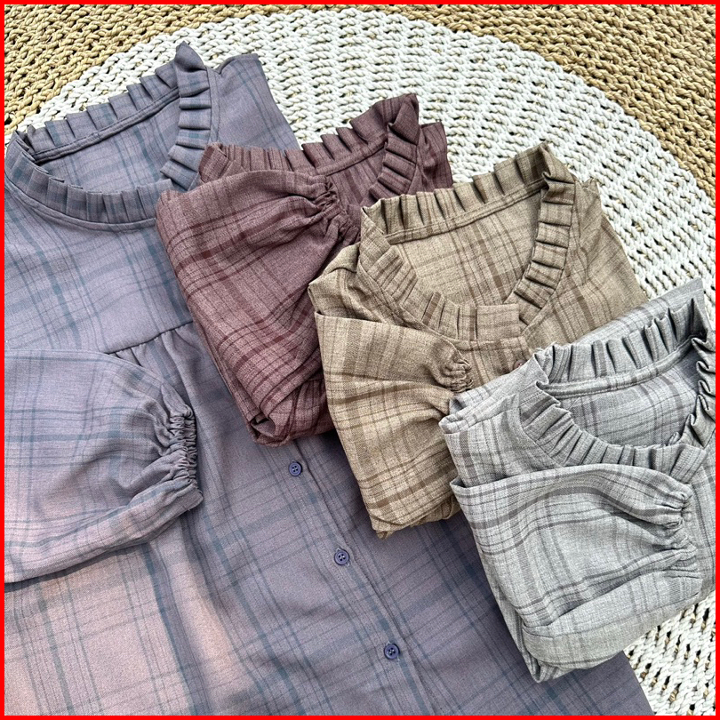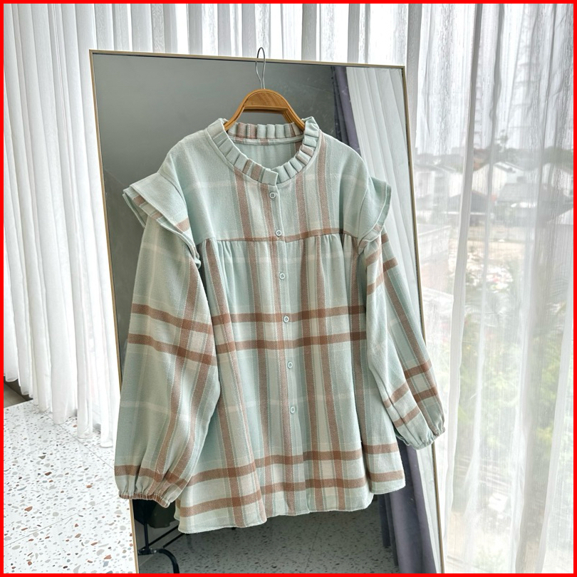 Myshirt Ruffle Collar Flannel Blouse Puff Sleeves Blouse Flanel Atasan Flanel