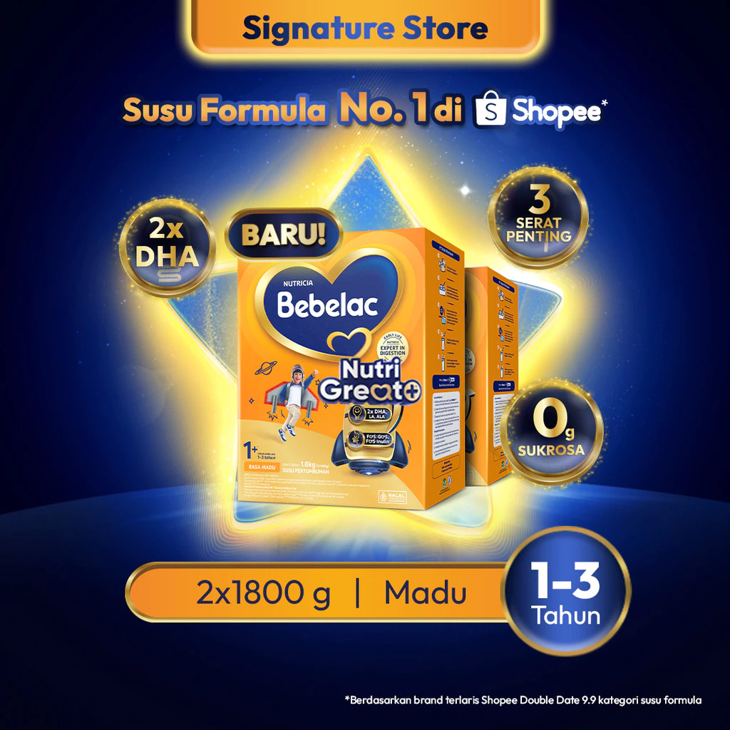 Bebelac 1+ (1-3 Tahun) Vanila/Madu 2x1800 gr Susu Pertumbuhan Bubuk