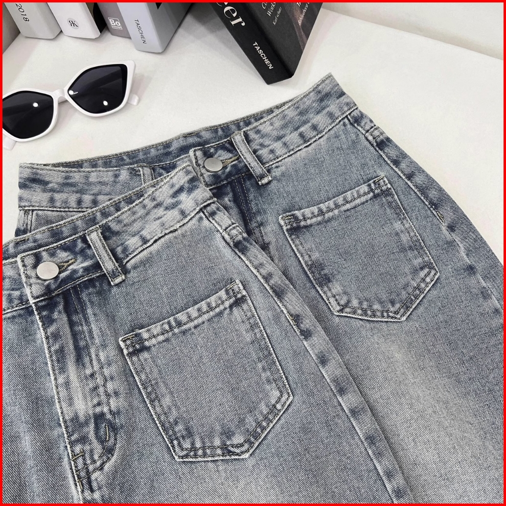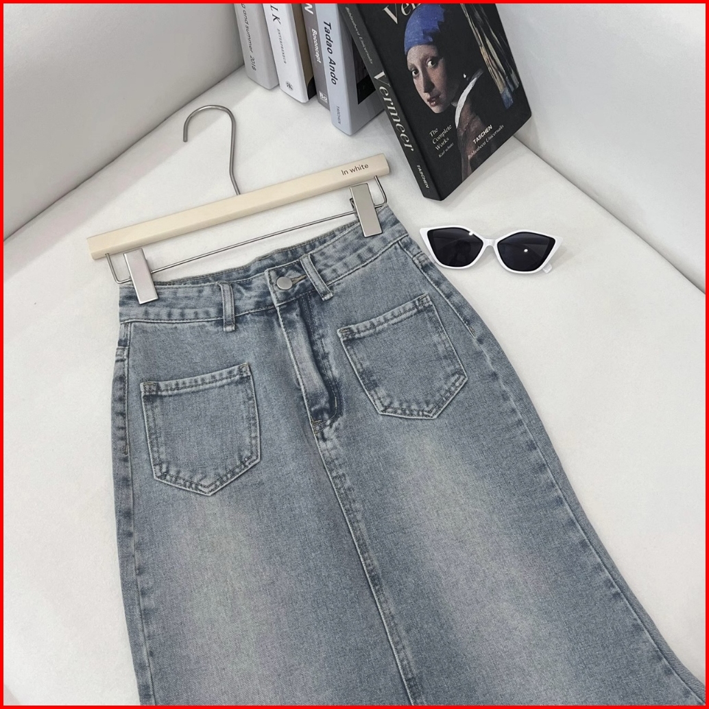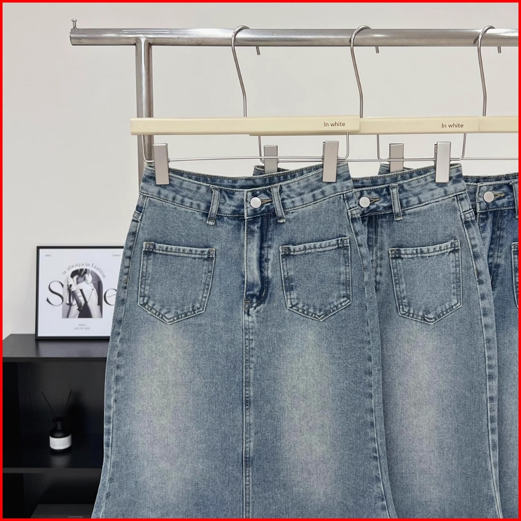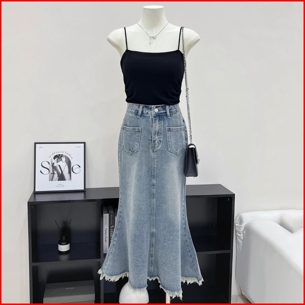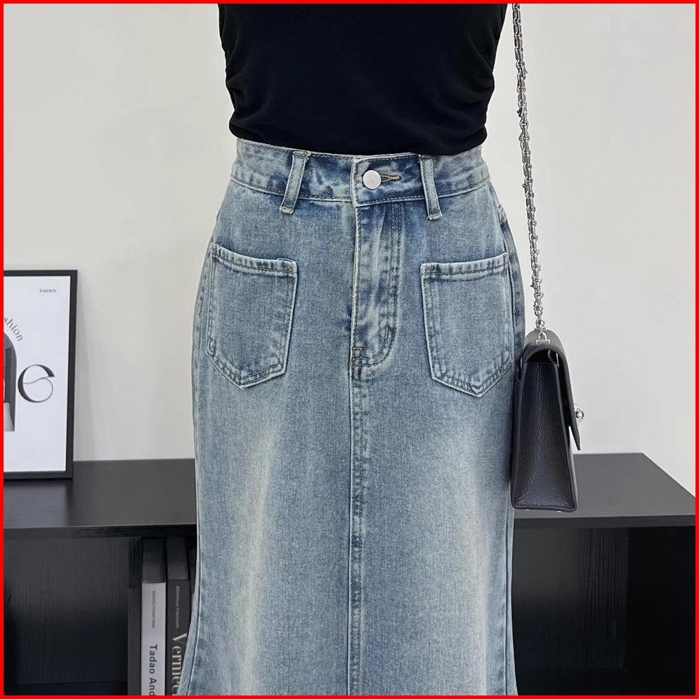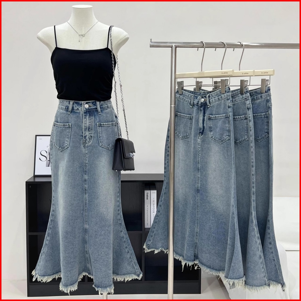 Elegan.girl Rok Denim Rok Fishtail Pinggang Tinggi A-line Pinggang Tinggi Gaya Korea Wanita Tepi Mentah Rok Jeans Mermai