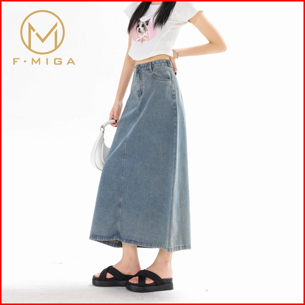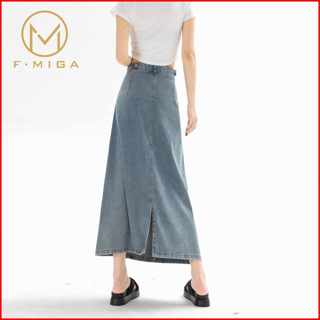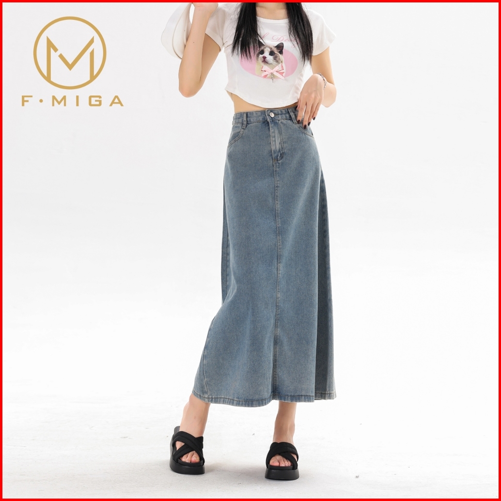 F Miga C46 High Waist Denim Rok Jeans Midi Wanita