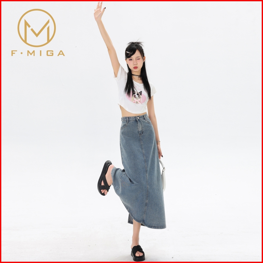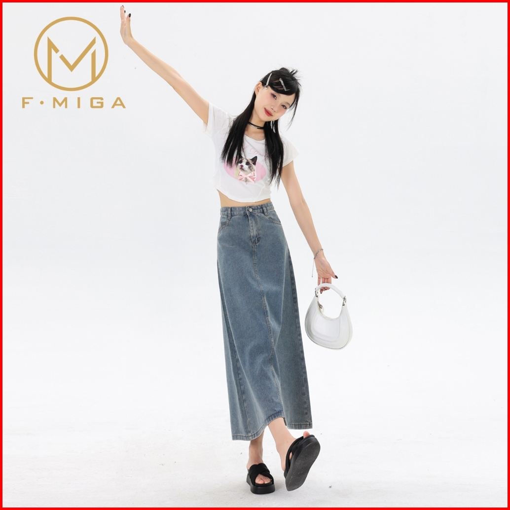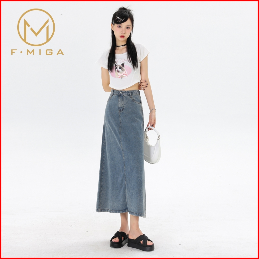 F Miga C46 High Waist Denim Rok Jeans Midi Wanita
