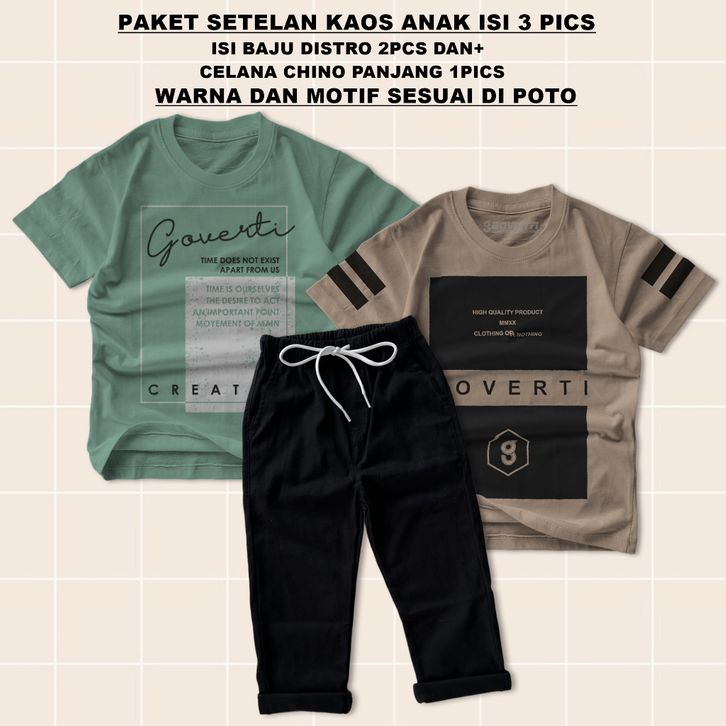 Paket 3 Pcs Setelan Kaos Distro Anak Laki-Laki & Celana Chino Panjang Usia 3-12 Tahun All Motif Unisex Kekinian