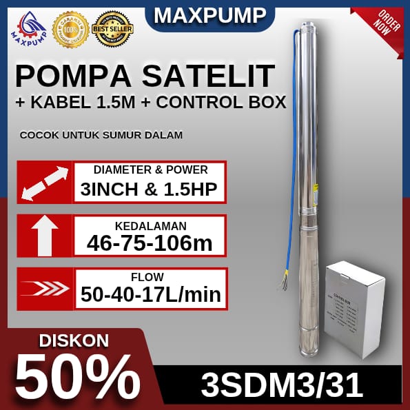 MAXPUMP 3SDM3/31 Pompa Submersible Pump Sumur dalam Pompa Satelit 3inch 1.5HP 220v 3"