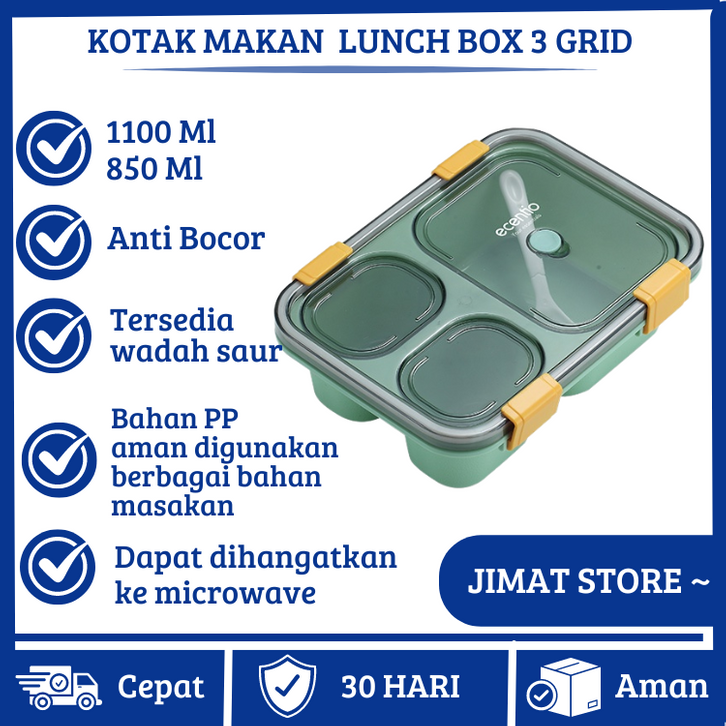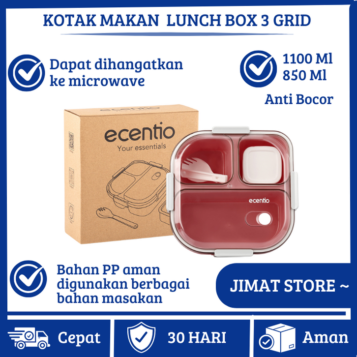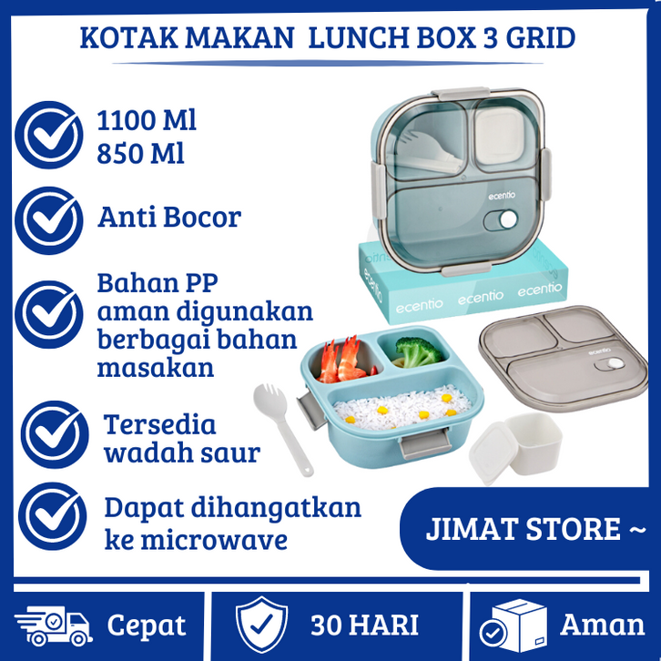 KOTAK MAKAN ANTI TUMPAH ECENTIO LUNCH BOX 3 GRID 1100 ML/850 ML WADAH BEKAL PRAKTIS LUNCHBOX FREE SENDOK KOTAK SUP 100ML