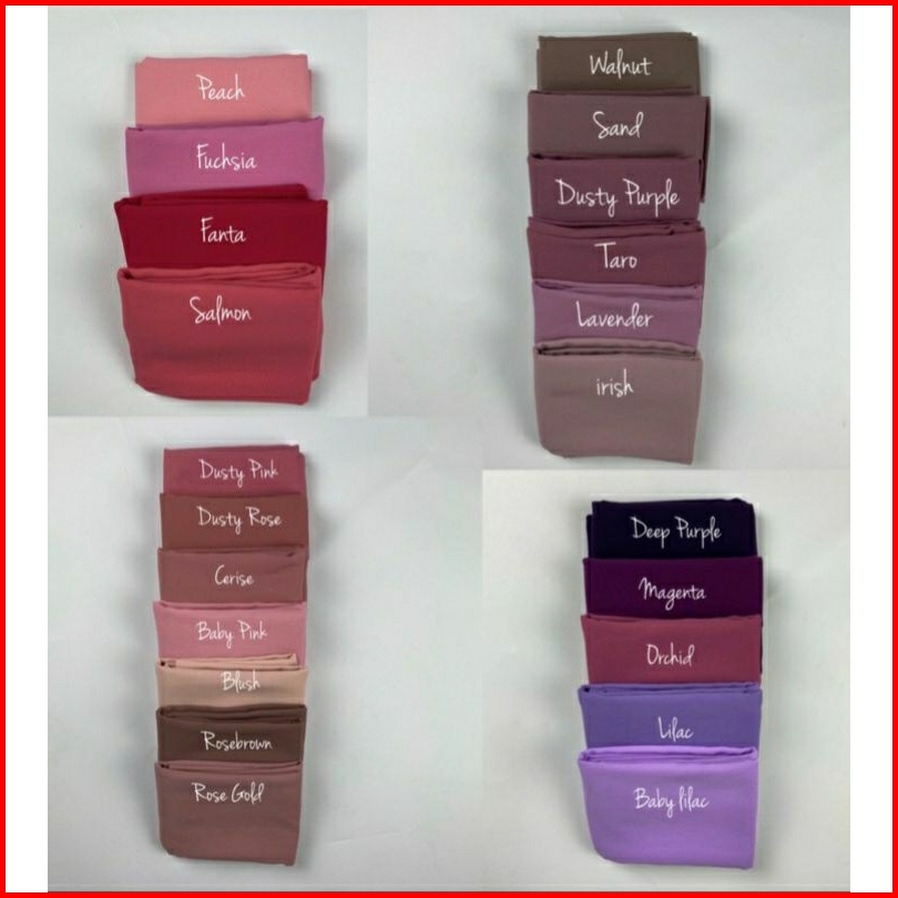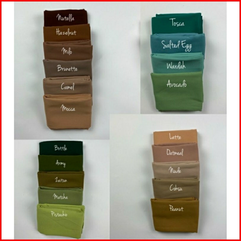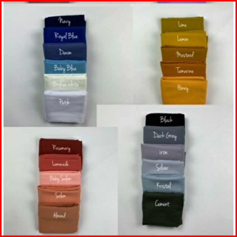 Black, Putih, Navy, Dark grey, Silver, Denim, Brunate, Walnut, Nude, Oatmeal, Rosebrown, Mocca, Hazelnut, Nutella, Dusty purple, Lavender, Irish, Salmon, Royal blue, Baby salem, Maron, Bata, Brick, Cofee, Matcha, Army, Bottle, Avocado, Zaitun, Peach, Baby pink, Blush, Dusty Pink, Lilac, Baby lilac, Chilli, Honey, Wardah, Camel, Broken white, Lemon, Baby blue, Peanut, Cerise, Rosegold, Mustard, Milo, Salem, Dusty rose, Latte
