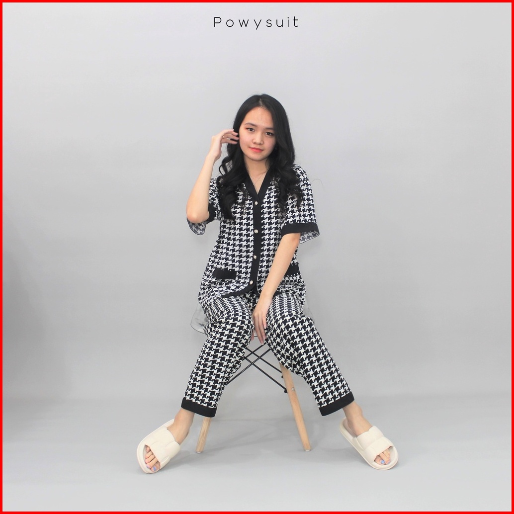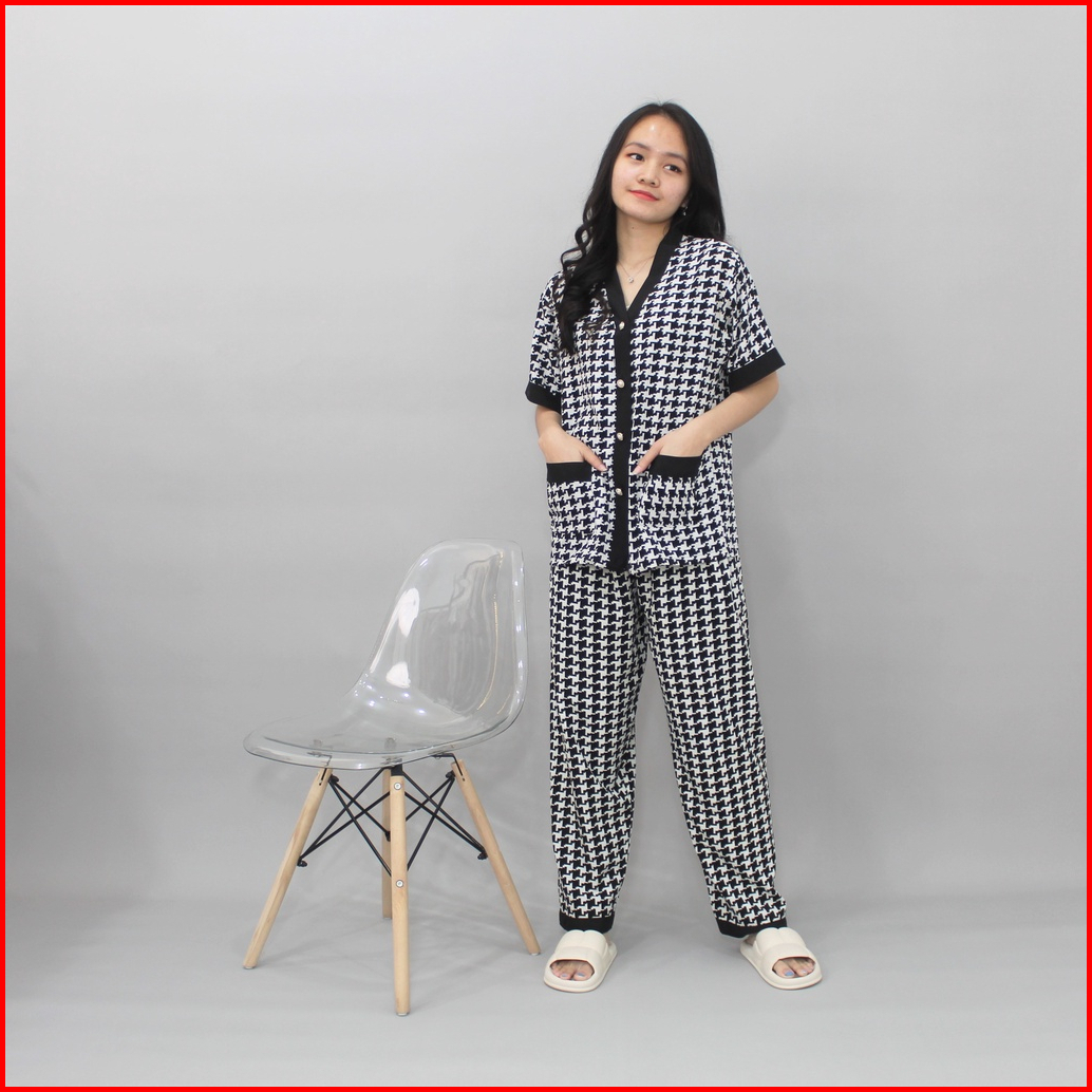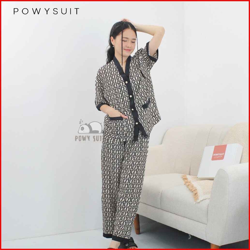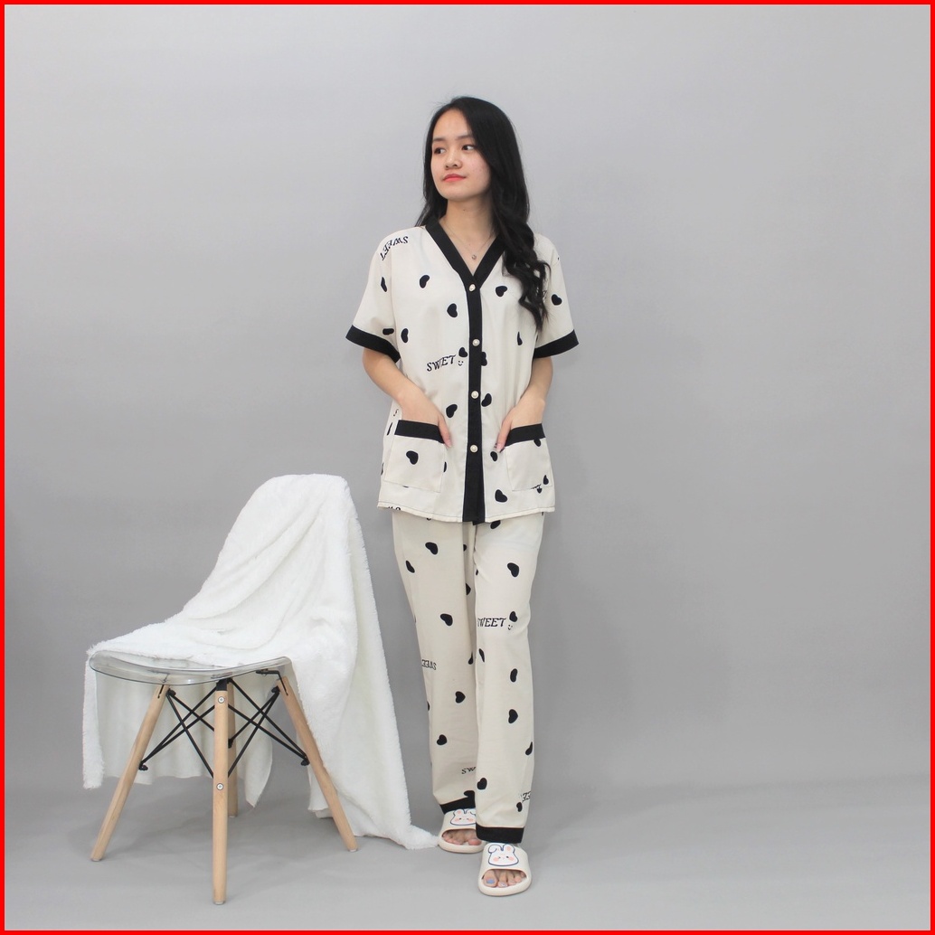 St Vianca Piyama Motif Pita Love Powysuit Bahan Satin Lengan Pendek Celana Panjang Baju Tidur Wanita