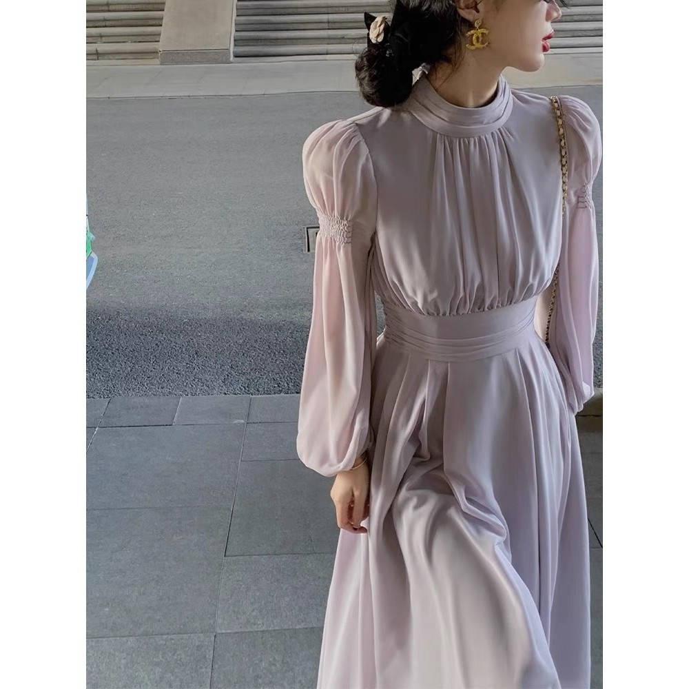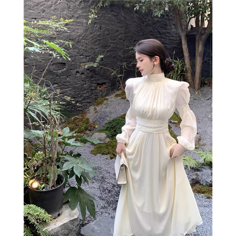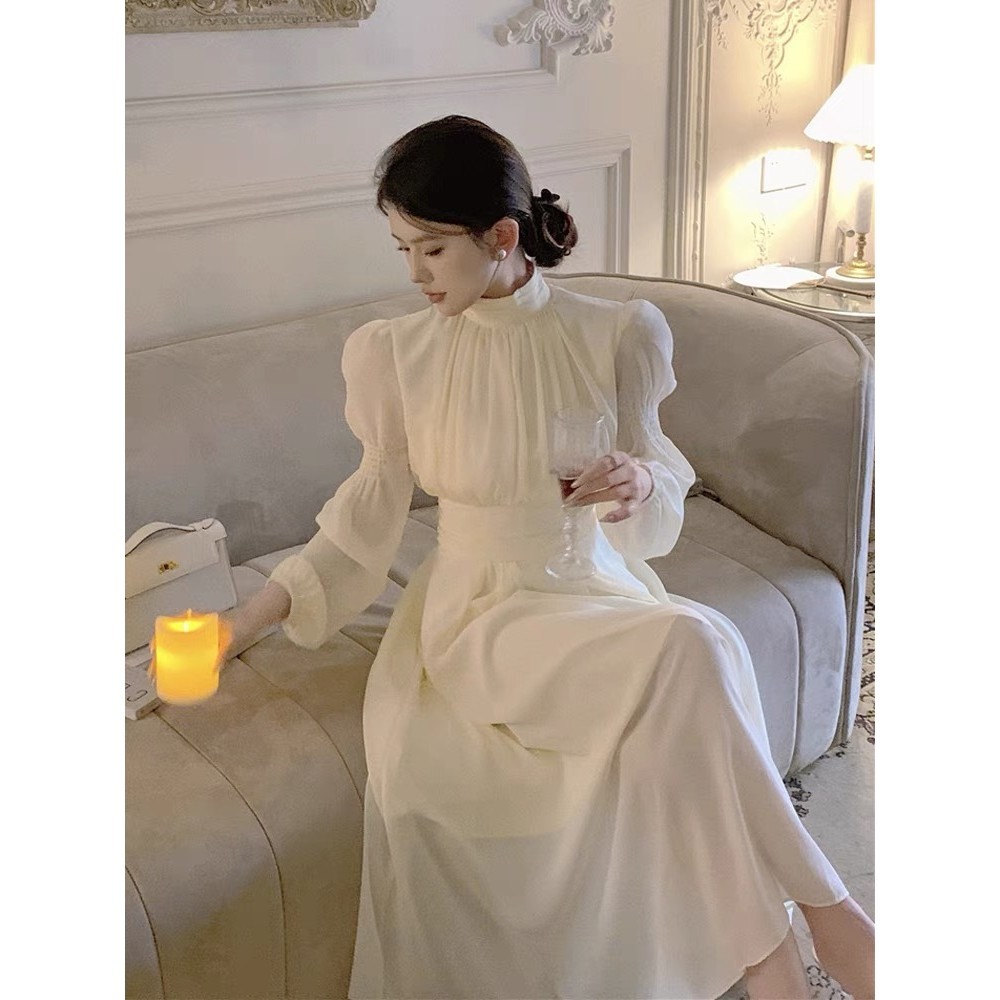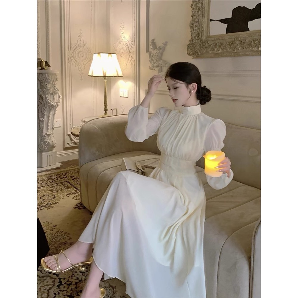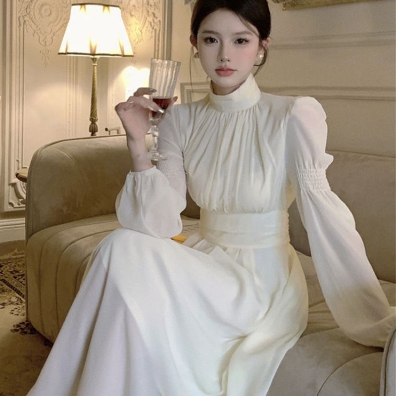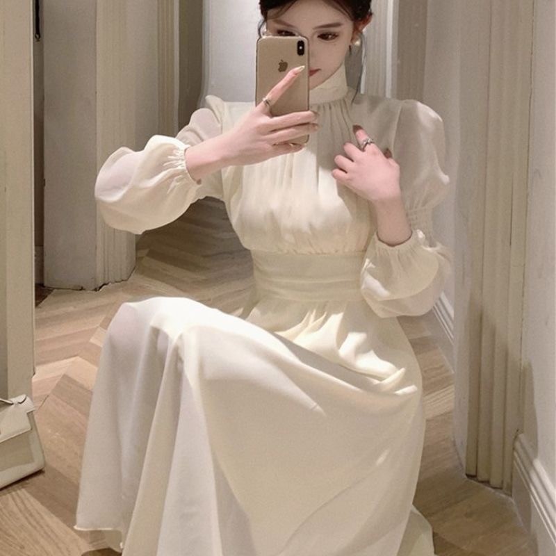 GAUN LENGAN PANJANG KERAH TINGGI PUTIH PRANCIS ROK TEMPERAMEN BARU MUSIM GUGUR PERI ROK PANJANG KELAS ATAS A-LINE