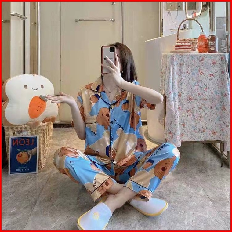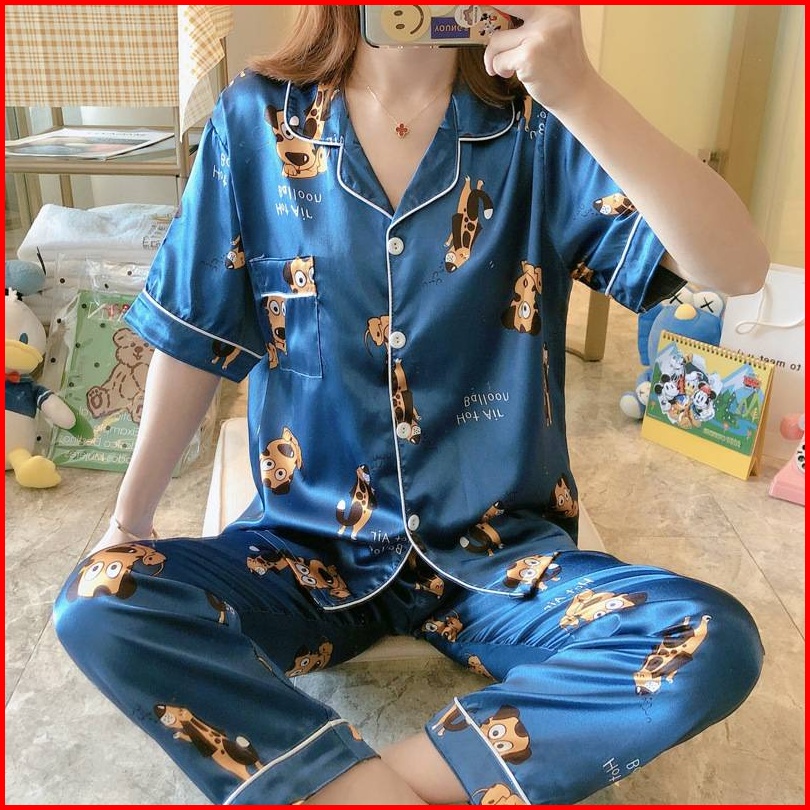 Piyama Satin Stelan Kancing Lembut Baju Tidur Wanita Motif Kartun Dan Lainnya Scp
