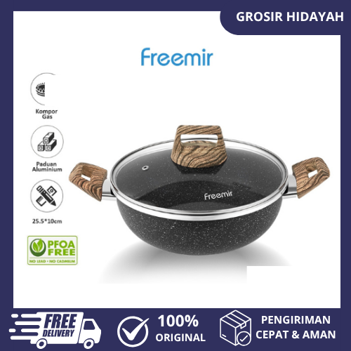 Wajan Panci Penggorengan 24cm Kedalaman 10cm Anti Lengket Marble Wok Pan Tutup Kaca Gagang Kayu Premium Termurah
