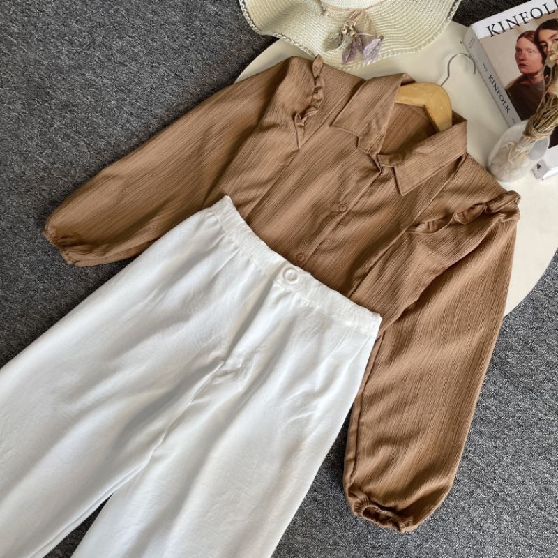 ONE SET SETELAN KERJA KULIAH WANITA KEMEJA LADYCRUSH DAN CELANA CRINKLE KOREAN STYLE HIGHWAIST MURAH ATASAN BAJU BASIC
