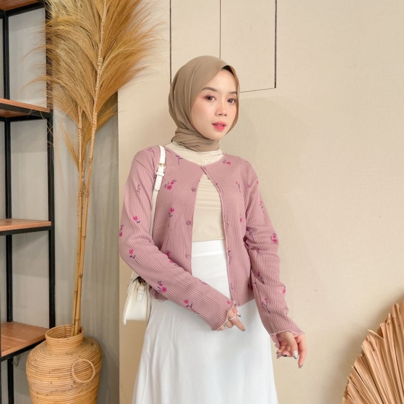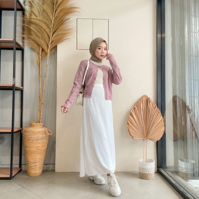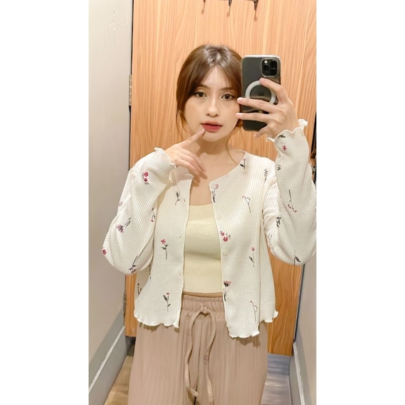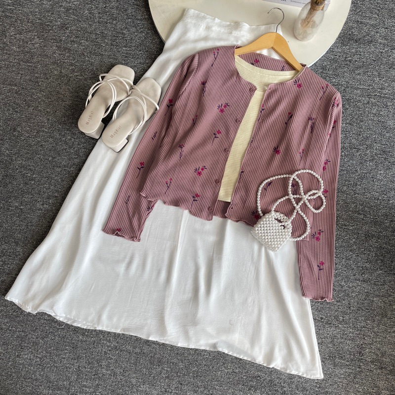 ONE SET KOREAN STYLE SETELAN WANITA CEWEK REMAJA BAJU ATASAN CARDI BUNGA LUCU ROK POLOS BUAT HEALING PIKNIK