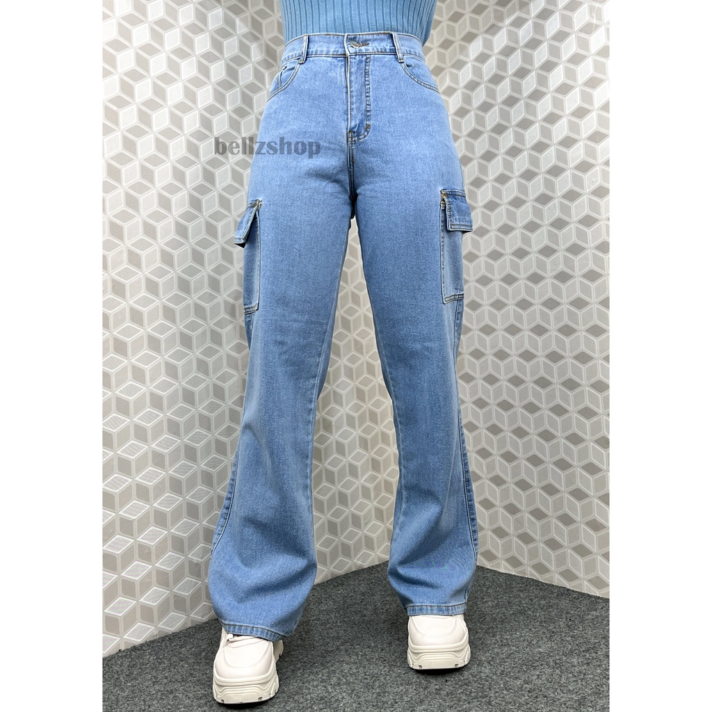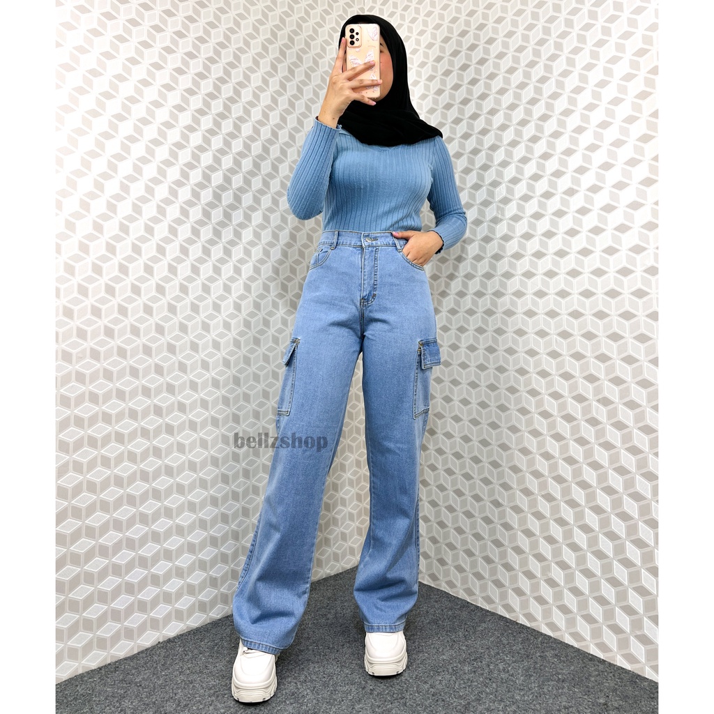 KEIRA CELANA KULOT JEANS CARGO WANITA HIGHWAIST PANJANG KEKINIAN JUMBO PREMIUM LIGHT BLUE