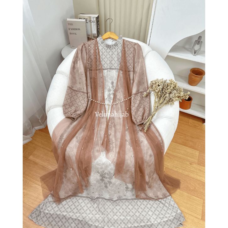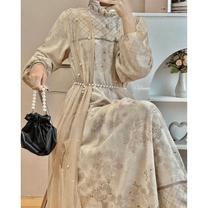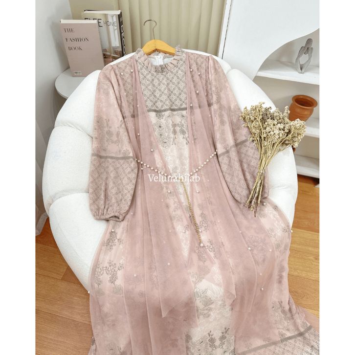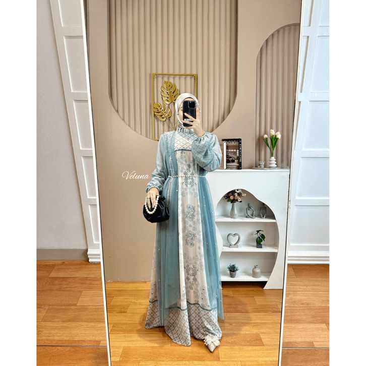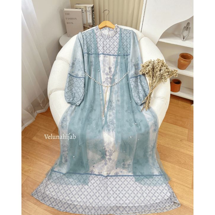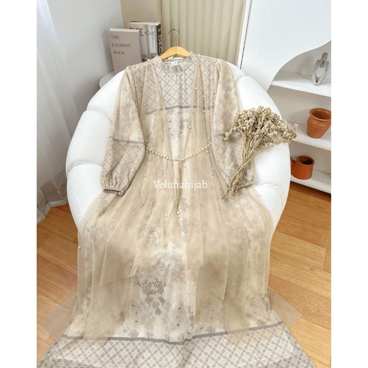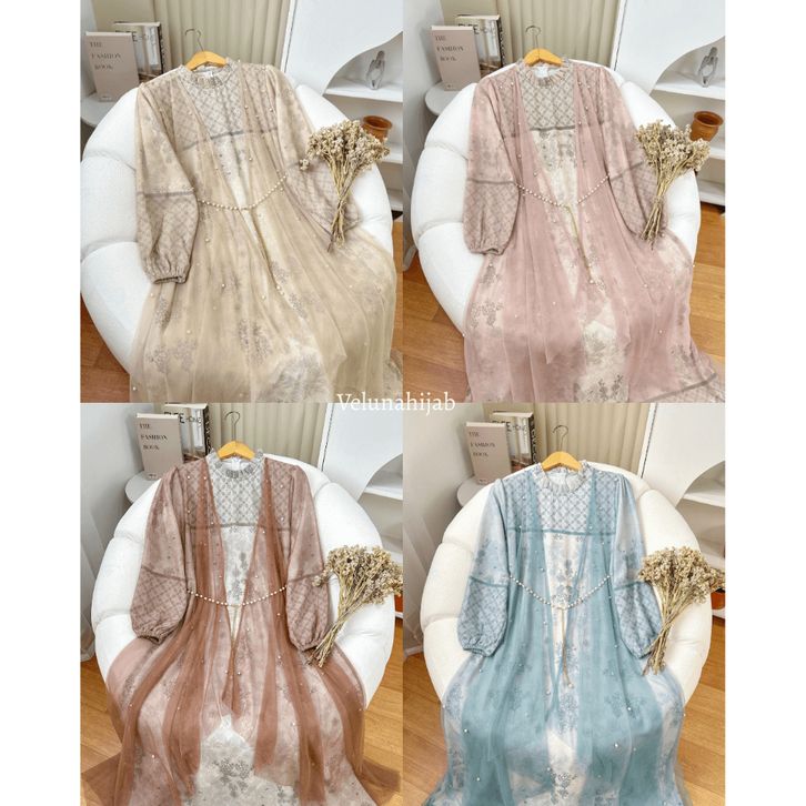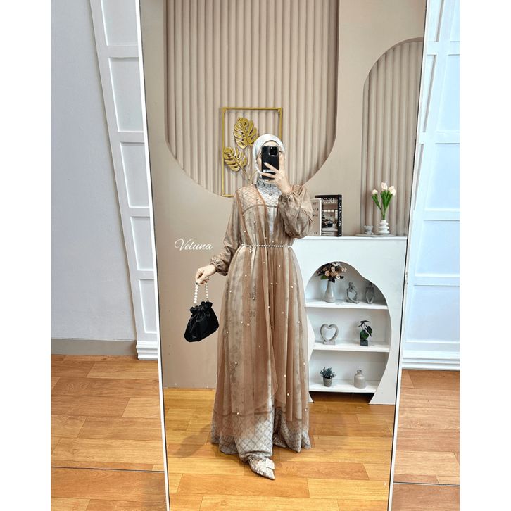 Veluna | Ravega Dress Lebaran Wanita Mewah Bahan Ceruty Full Furing Dengan Outer Tile Polos Dan Ban Mutiara