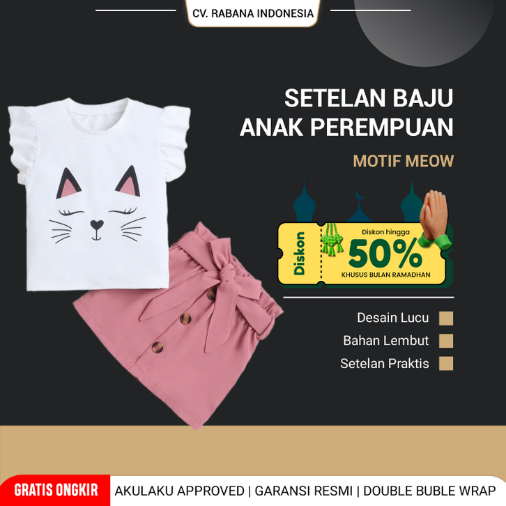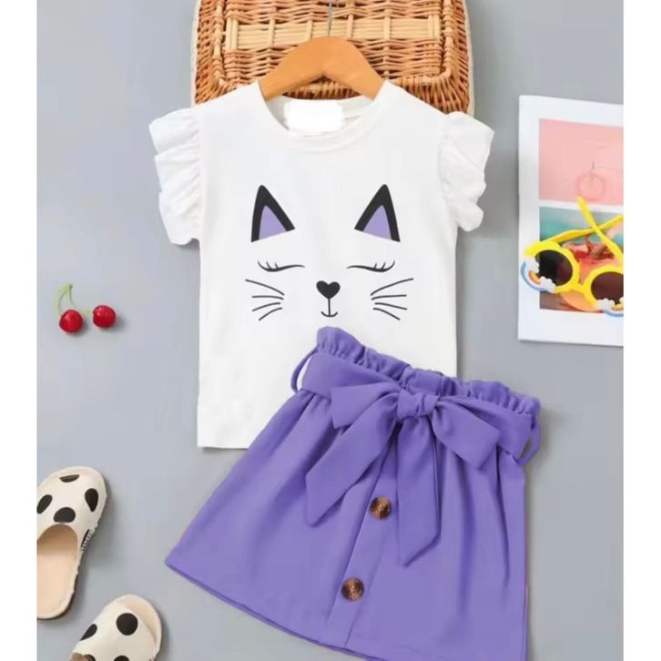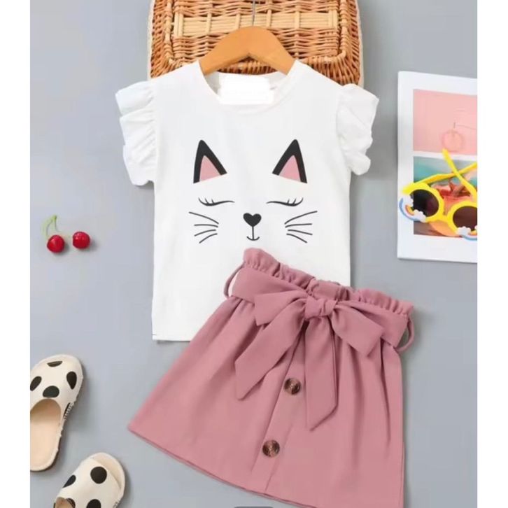 Set Pakaian Anak Perempuan Setelan Baju Motif Meow Fashion Modis Baju Celana Cewek Bahan Katun Combed Premium