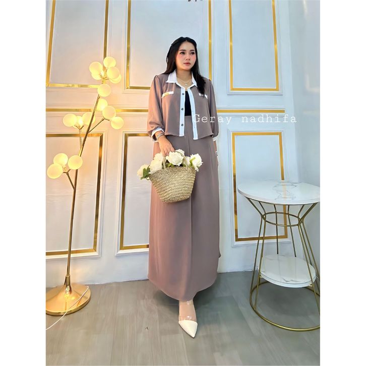 Setelan Rok Crop Kancing Wanita One Set Rok Panjang Atasan Outer Fashion Kekinian Cewek Bahan Cringkel Airflow