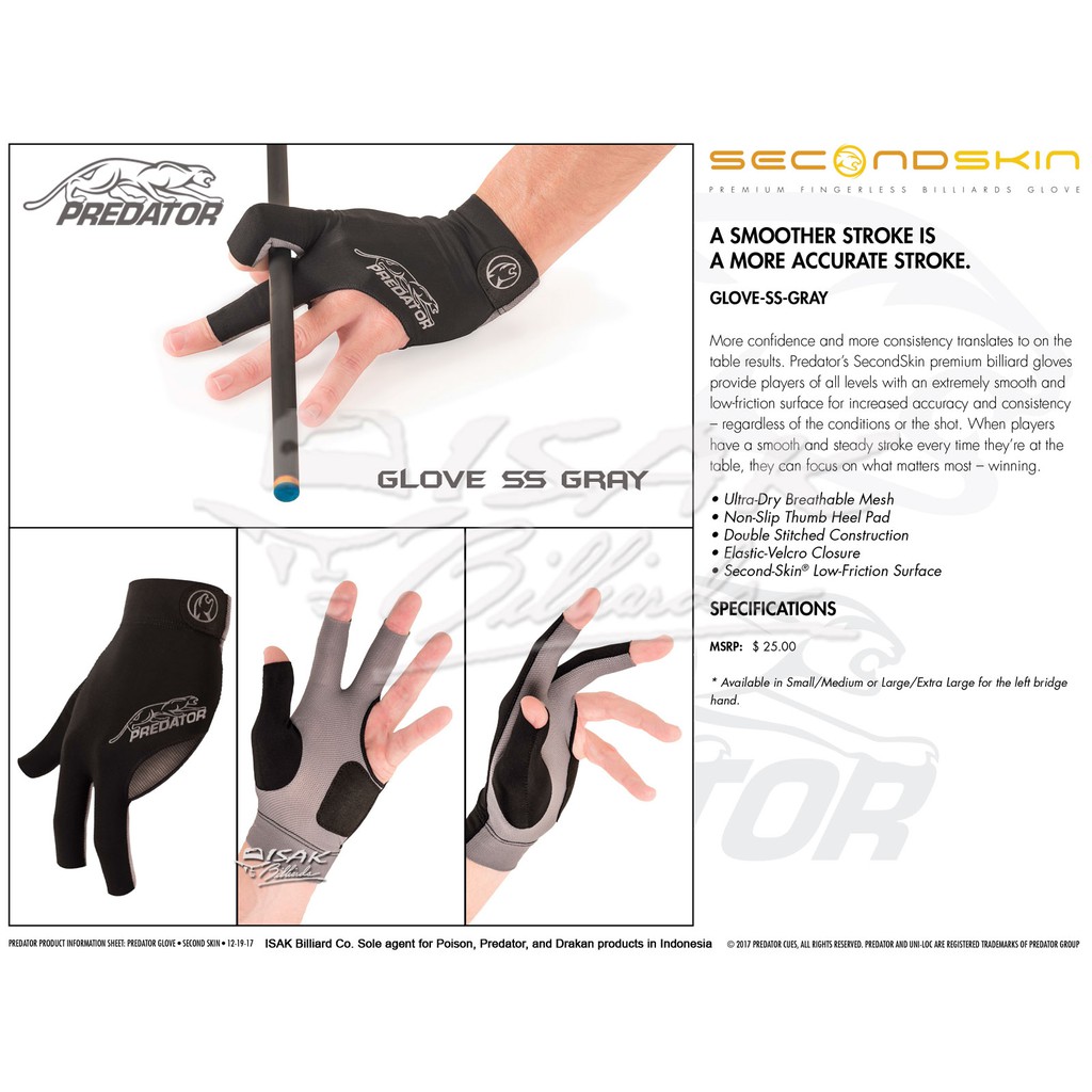 PREDATOR GLOVE KIDAL SS GRAY - L/XL SARUNG TANGAN BILLIARD BILIAR POOL SECOND SKIN ASLI