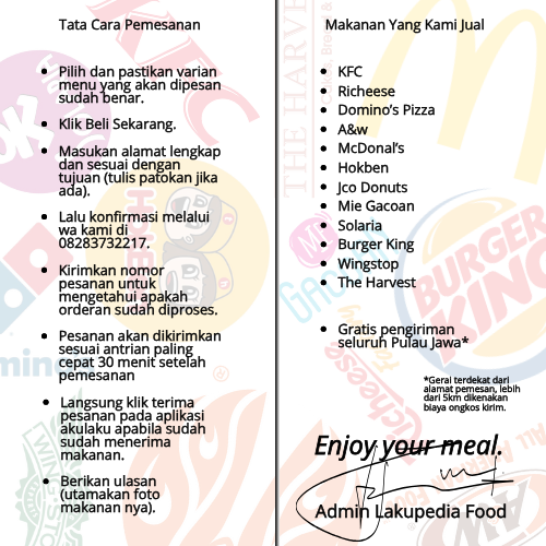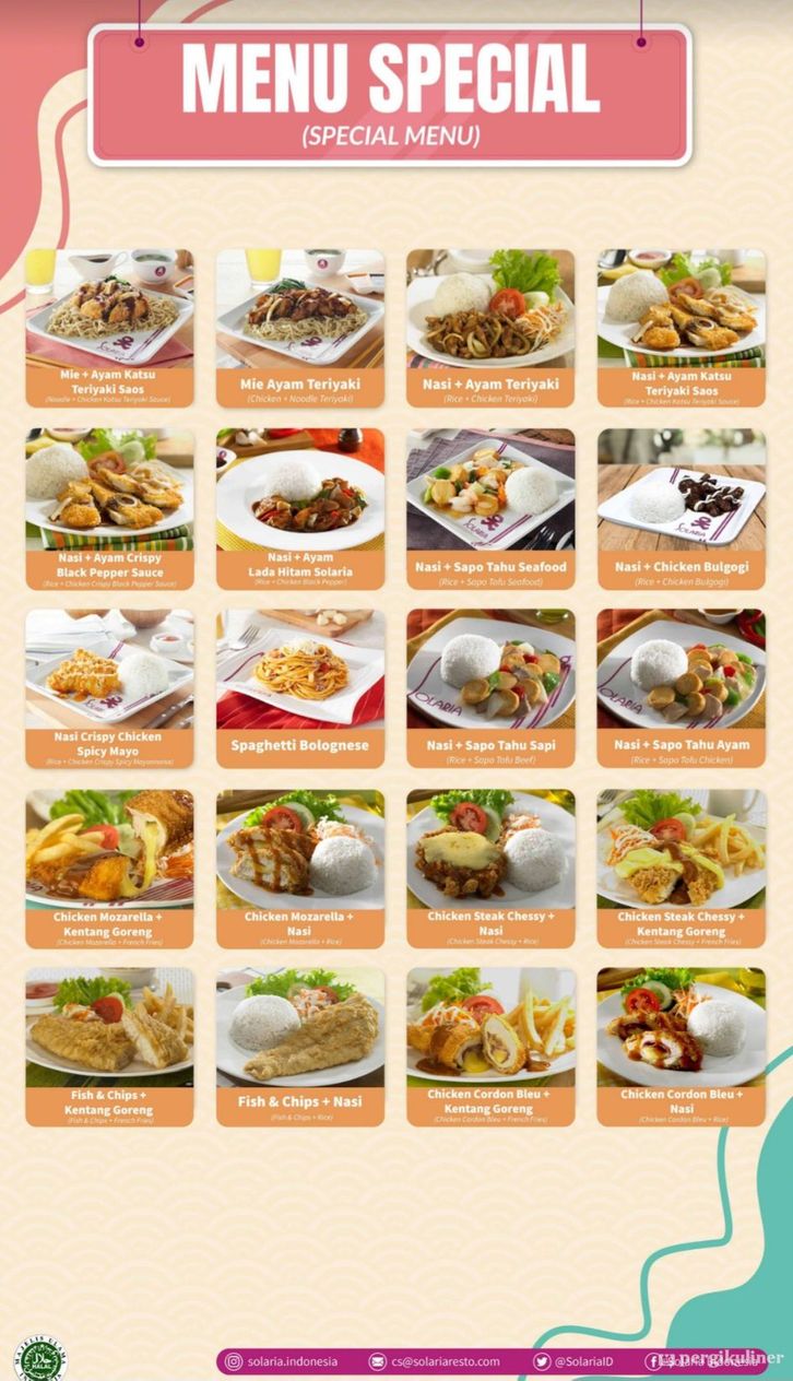 Nasi + Ayam Crispy Black Pepper Sauce, Nasi + Ayam Crispy Chicken Spicy Mayo, Mie Ayam Teriyaki, Nasi Ayam Teriyaki, Nasi + Ayam Katsu Teriyaki Saos, Mie + Ayam Katsu Teriyaki Saos, Nasi + Ayam Lada Hitam, Nasi + Chicken Bulgogi, Nasi + Sapo Tahu Ayam, Nasi + Sapo Tahu Sapi, Nasi + Sapo Tahu Seafood, Chicken Cordon Bleu + Nasi, Chicken Cordon Bleu + Kentang, Chicken Mozarella + Nasi, Chicken Mozarella + Kentang, Chicken Steak Chessy + Nasi, Chicken Steak Chessy + Kentang, Fish & Chips + Nasi, Fish & Chips + Kentang, Lo Mie, I Fu Mie Ayam, I Fu Mie Seafood, Nasi Goreng, Nasi Goreng Special, Nasi Goreng Modern, Smoked Chicken Fried Rice, Nasi Goreng Italy, Nasi Goreng Kambing, Nasi Goreng Bebek Cabe Ijo, Nasi Goreng Sapi Cabe Ijo, Nasi Goreng Teri Cabe Ijo, Nasi Goreng Teri Medan, Nasi Goreng Petai, Nasi Goreng Sosis, Nasi Goreng Seafood, Nasi Goreng Kepiting Rajungan, Nasi Goreng Tom Yum Ayam, Nasi Goreng Tom Yum Seafood