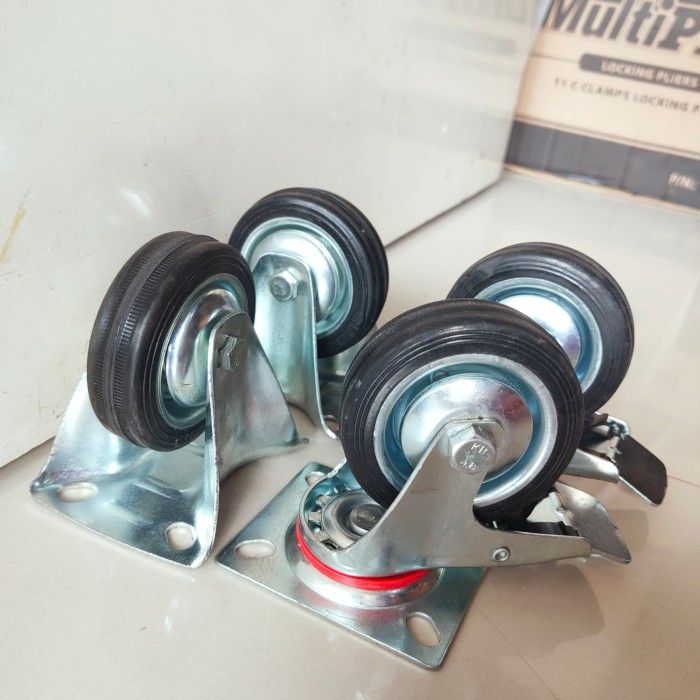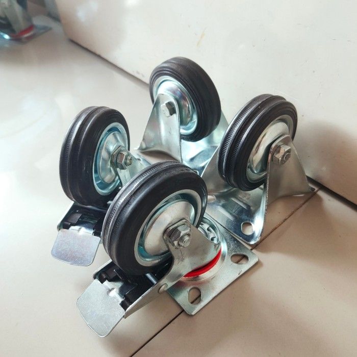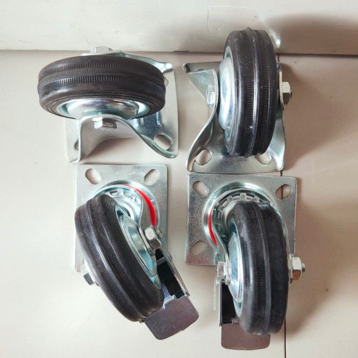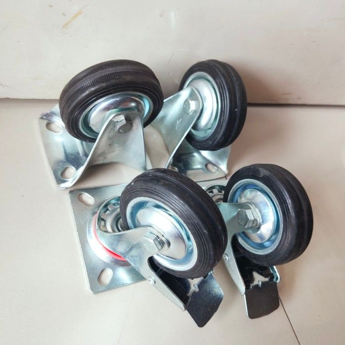 Paket roda 3" karet hitam 2 Rem 2 Mati Roda troli set 4 pcs 3in