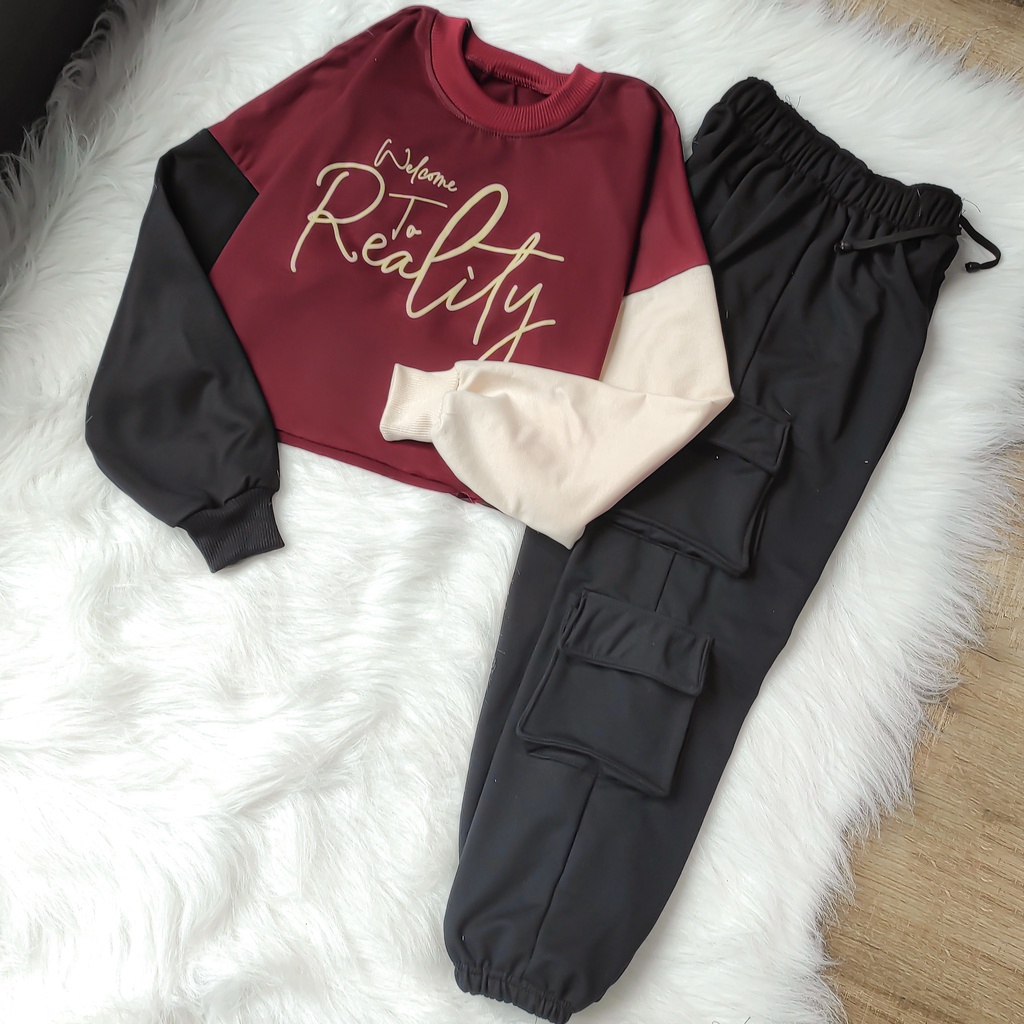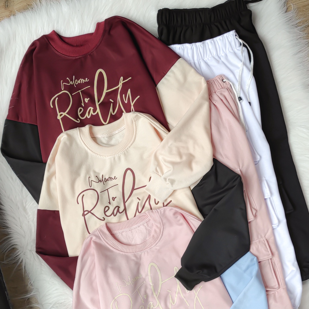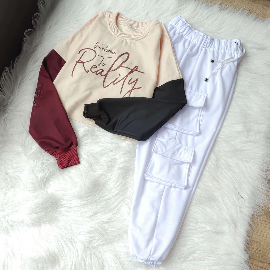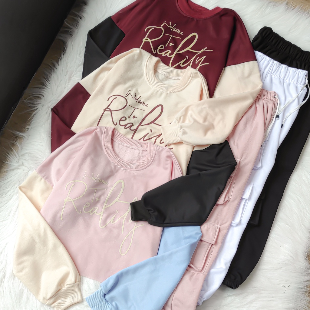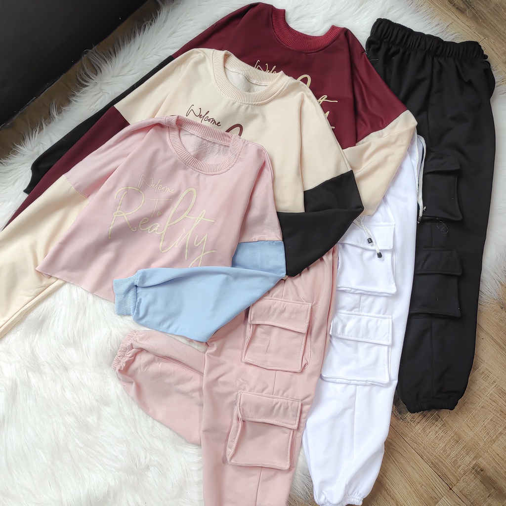 SETT REALITY SWEATER CROP & JOGGER GAMBLOK HIGHWAIST CARGO WANITA SETELAN OLAH RAGA KEREN SPORTY