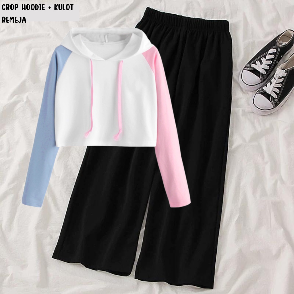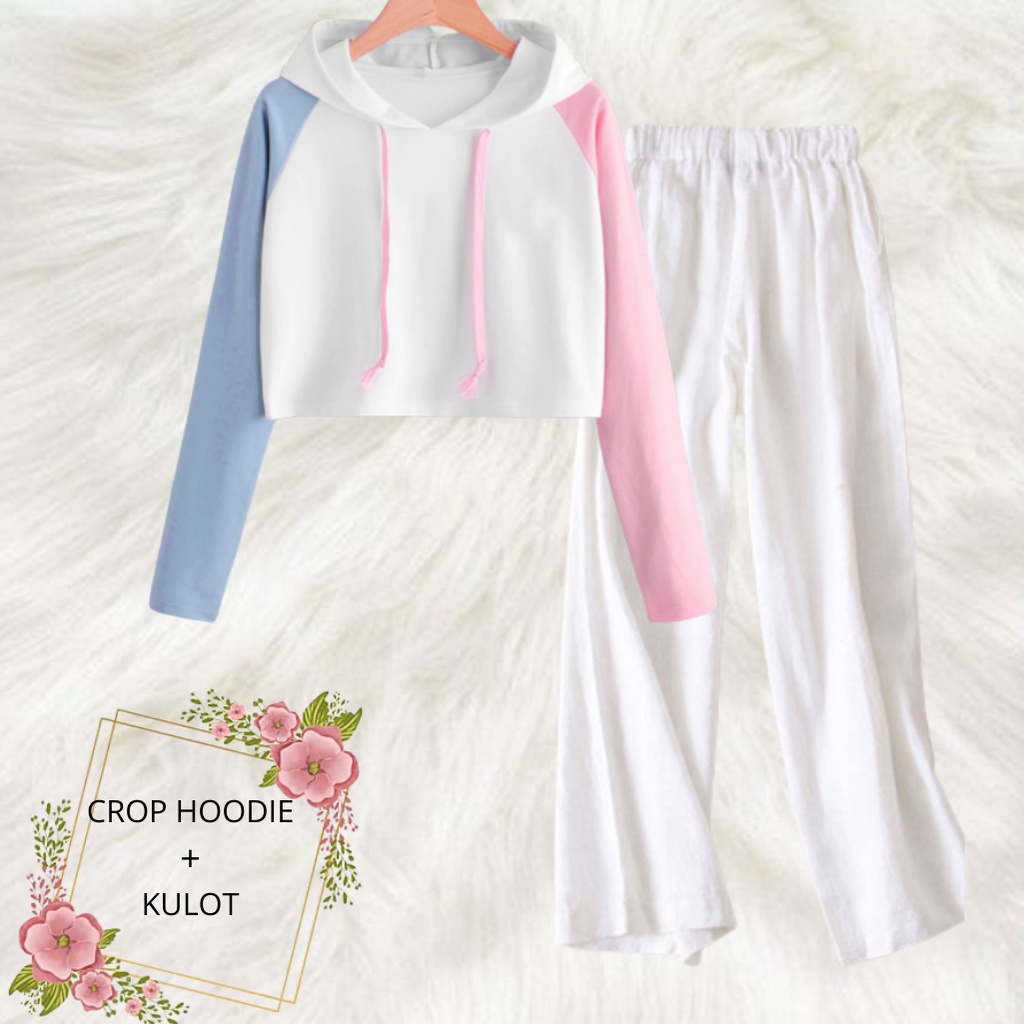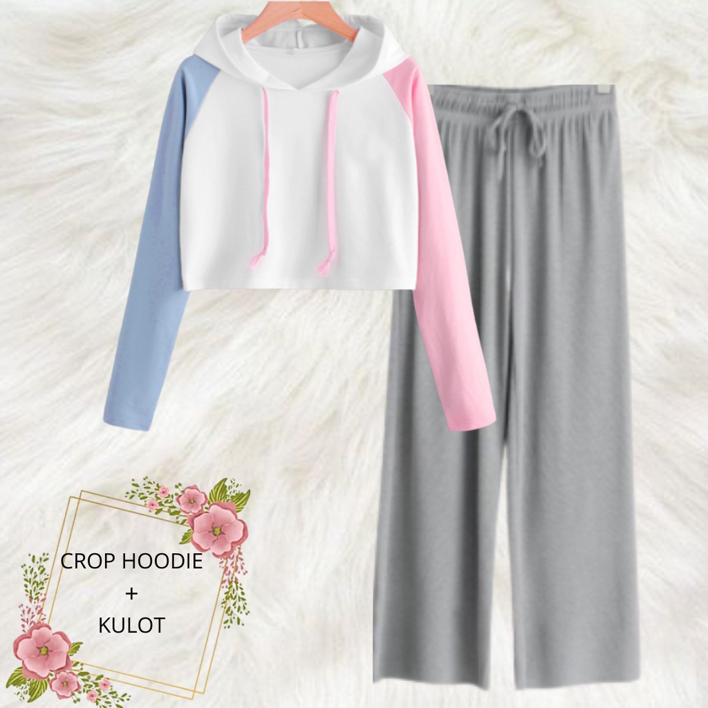 JBF SETELAN CROP HOODIE KOMBINASI WARNA DAN CELANA KULOT REMEJA ABG STYLE KEKINIAN BAJU KOREAN STYLE