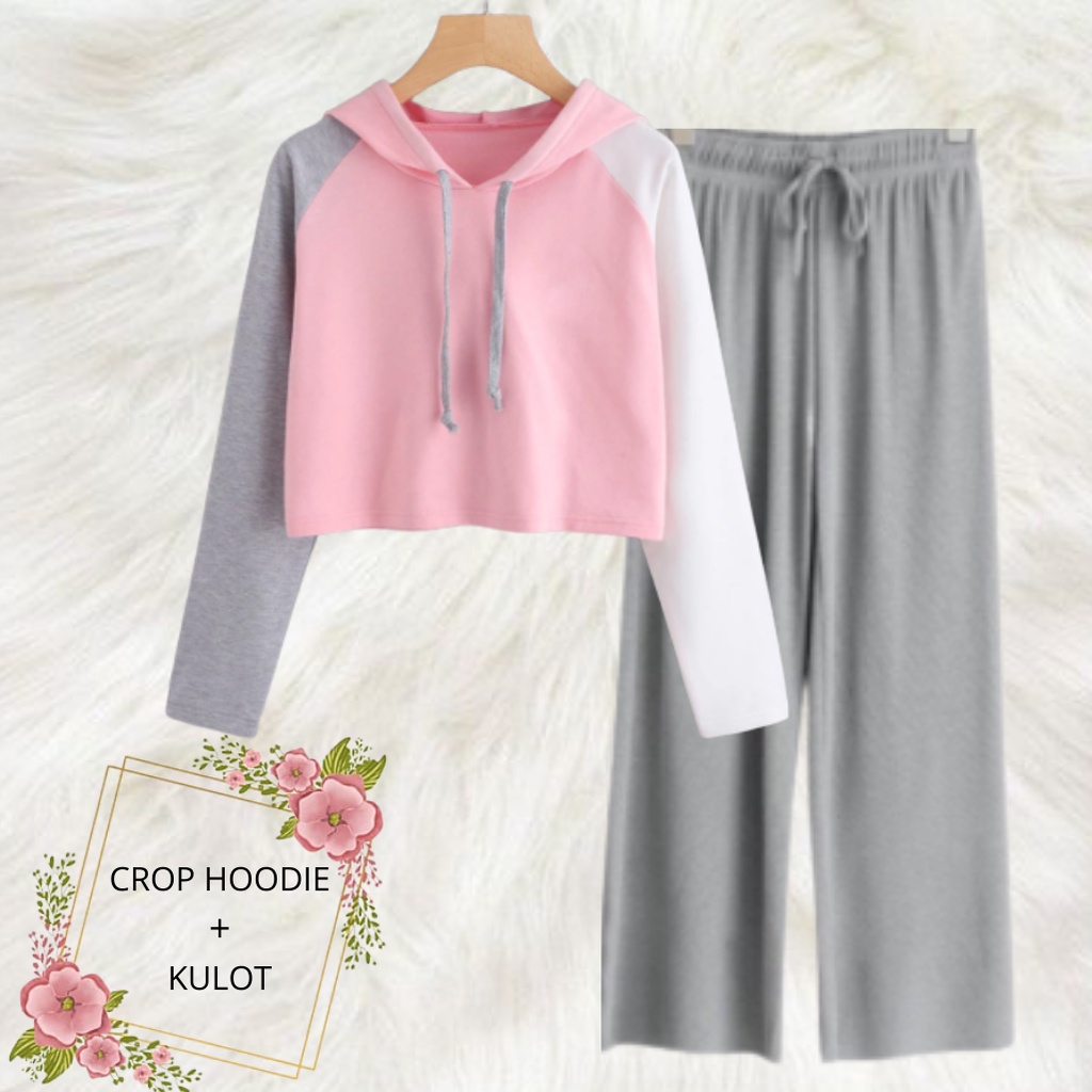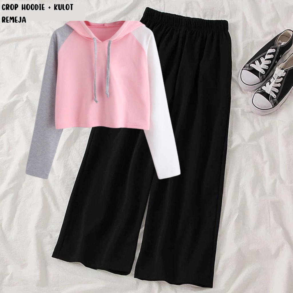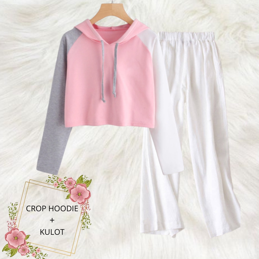 JBF SETELAN CROP HOODIE KOMBINASI WARNA DAN CELANA KULOT REMEJA ABG STYLE KEKINIAN BAJU KOREAN STYLE