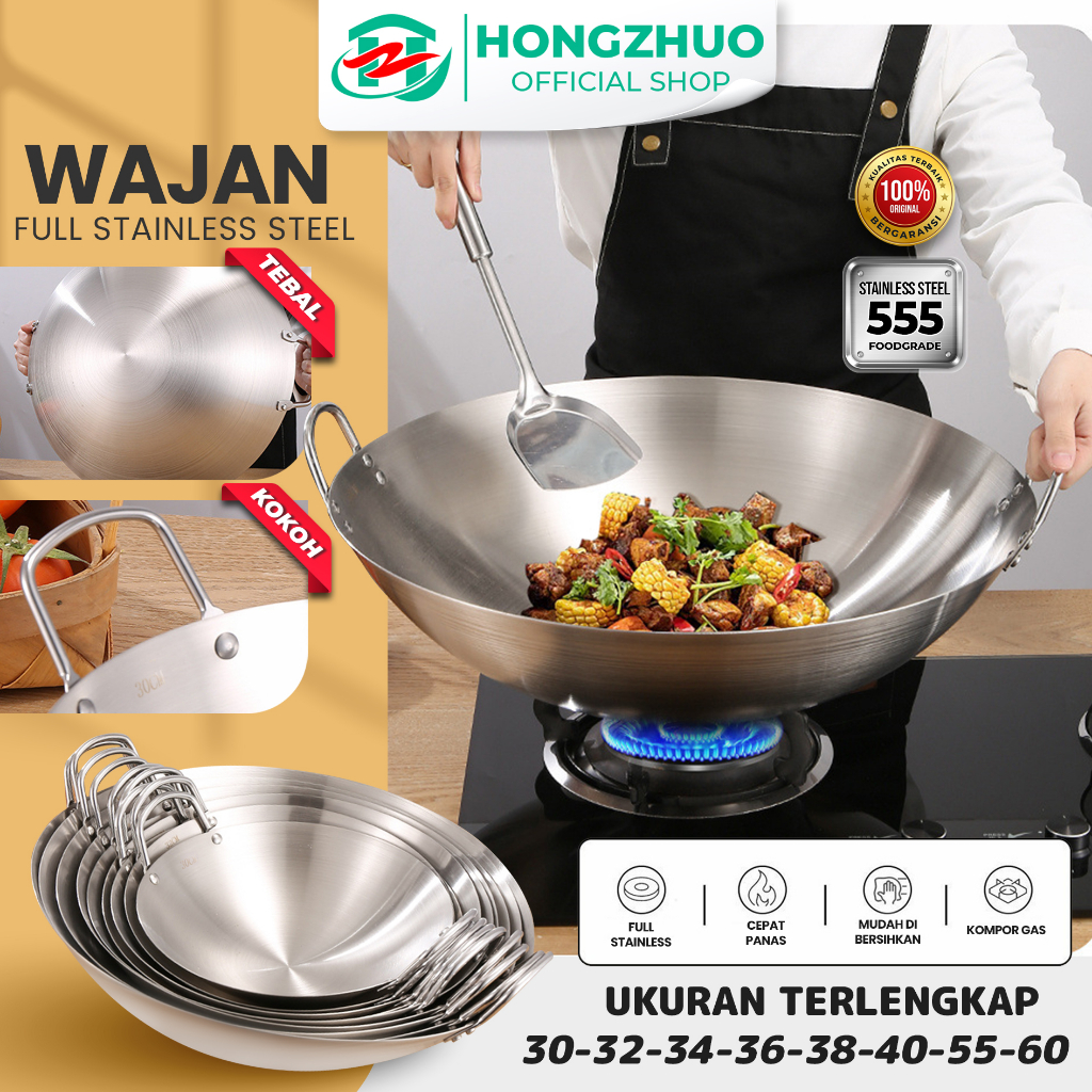 HONGZHUO WAJAN STAINLESS 555 TEBAL KUALI PREMIUM DENGAN PEGANGAN STAINLESS STEEL KUALI BESAR KATEL ANTI LENGKET