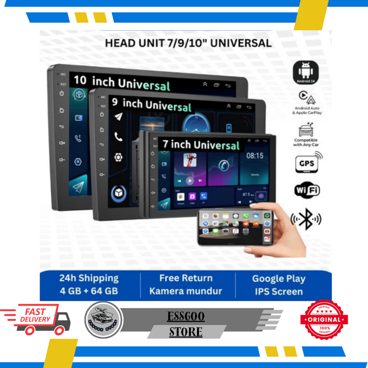 Head Unit Android 14 Mobil 2 Din 7/9/10 Inch 4GB+64GB Wifi GPS Wireless CarPlay Bluetooth Universal