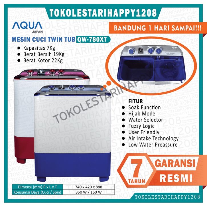 (FREE ONGKIR JAWA BARAT JABOTABEK) MESIN CUCI 2 TABUNG AQUA QW 750/760/780 XT GARANSI RESMI