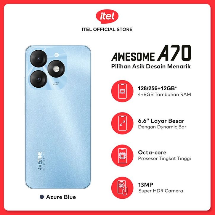 Itel Official Store HP Tanpa DP A70 4+256GB Big Screen with Dynamic Bar GARANSI RESMI