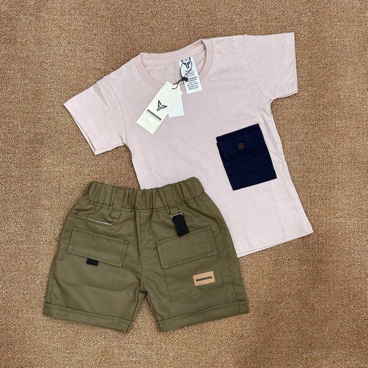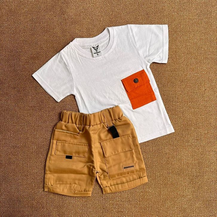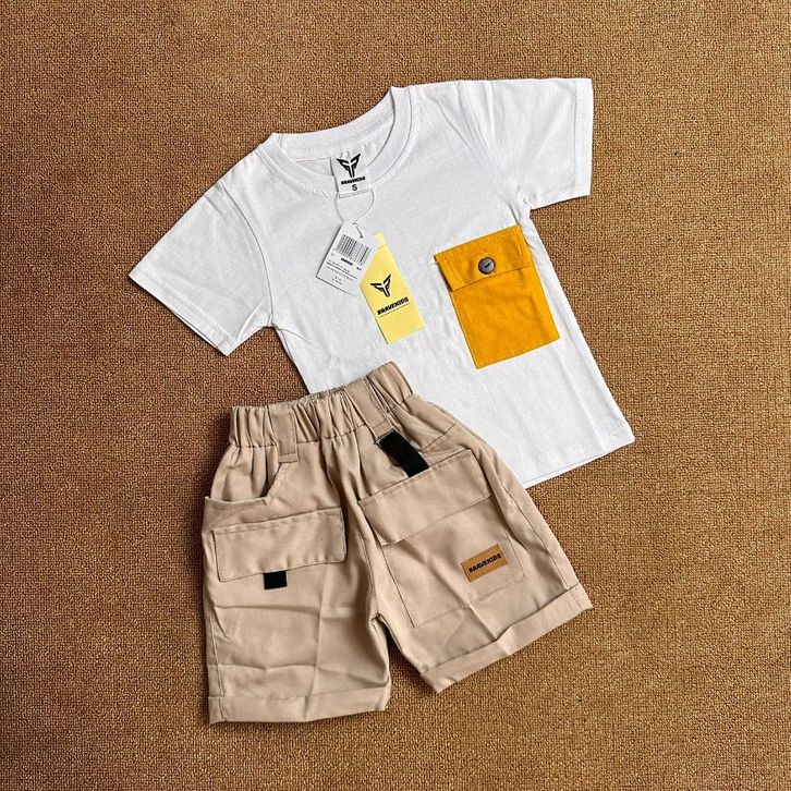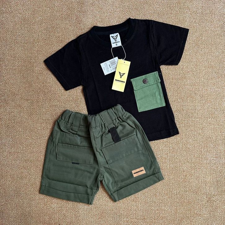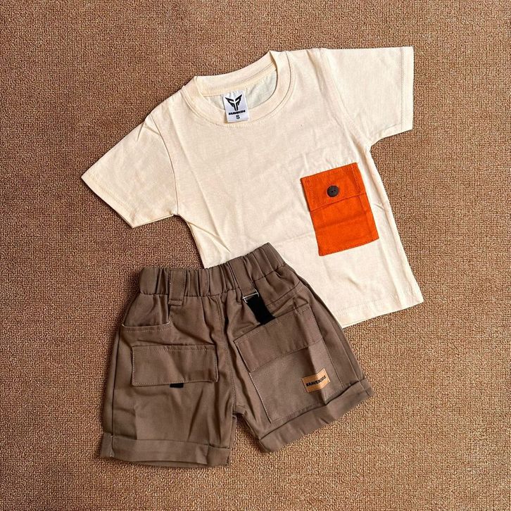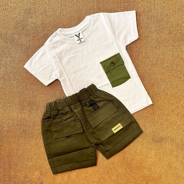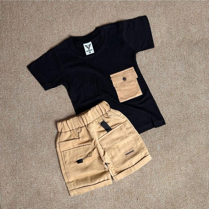 BAJU SETELAN ANAK CARGO POCKET TEES KATUN 24s UMUR 1-5 TAHUN T SHIRT KAOS DAN CELANA COTTON DRILL KARGO/TERLARIS/TERBARU