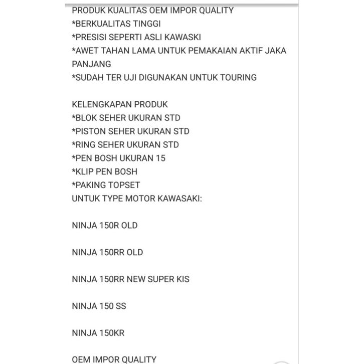 Blok Seher 1855+Piston Kit Pen 15 Ninja 150R Old Ninja 150Rr Ninja 150Rr New Ninja 150Ss Super Kis Oem Impor Quality