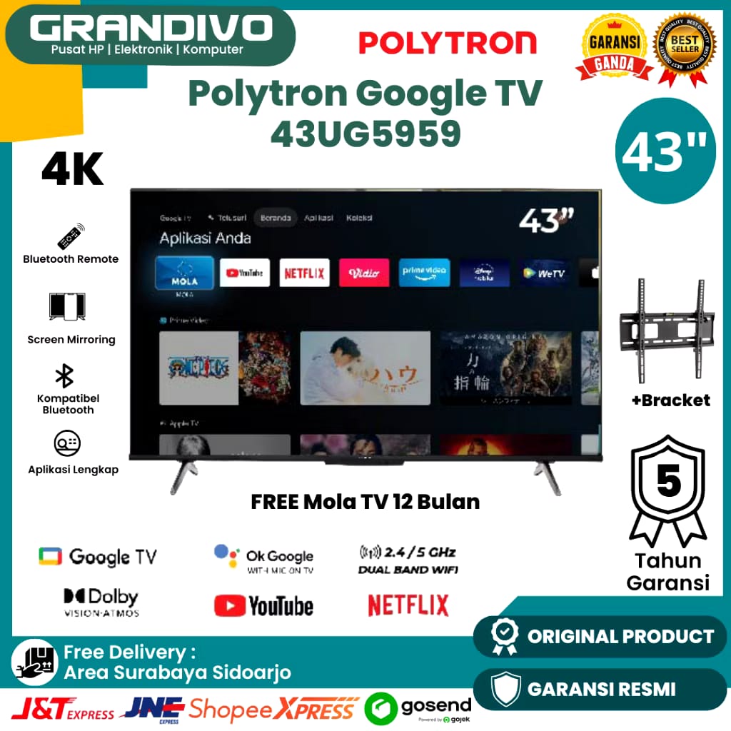 Android TV POLYTRON 4K Google UHD 43 Inch PLD 43UG5959 GARANSI RESMI - GRANDIVO