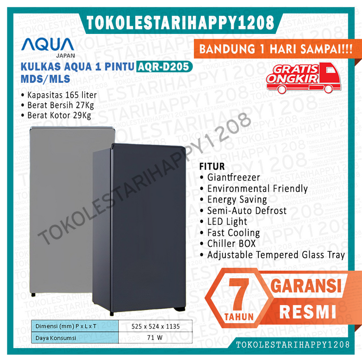 (FREE ONGKIR JAWA BARAT JABOTABEK) KULKAS AQUA 1 PINTU AQR-D205 MDS/MLS/MSB/MSG BIG FREEZER LOW WATT GARANSI RESMI