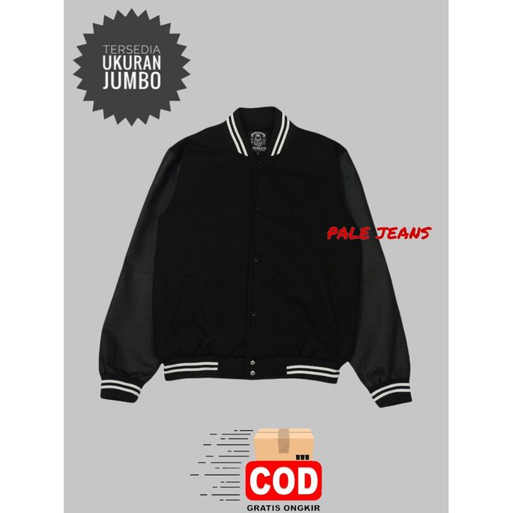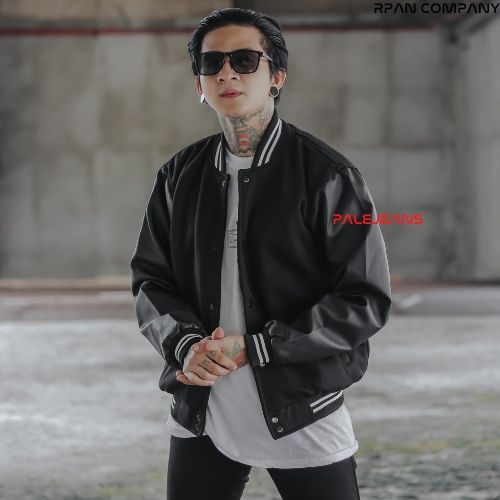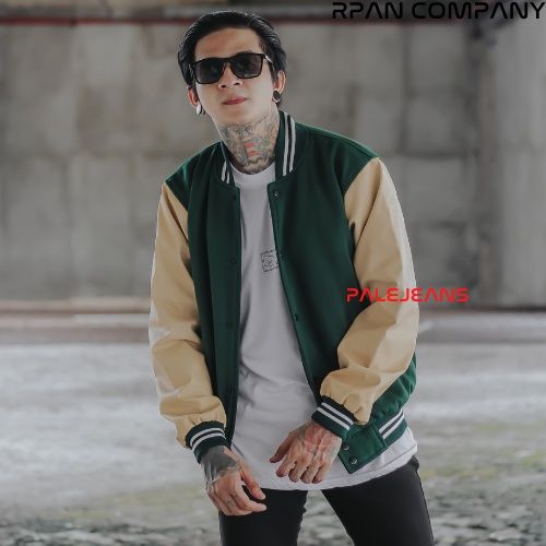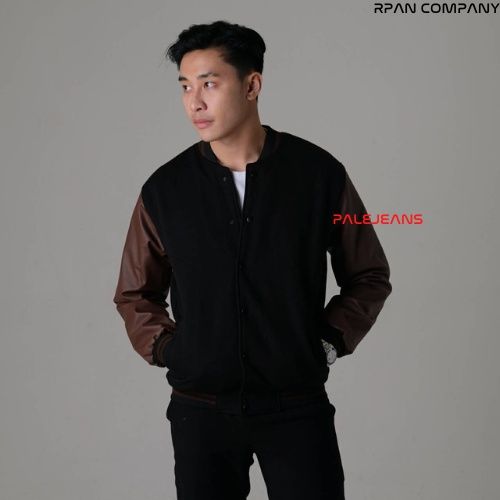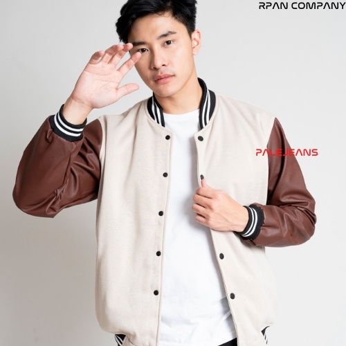 Jaket Bomber Keren Baseball Pria Fashion Pakaian Musim Dingin Motif Polos Lengan Panjang Bahan Cotton Flecce Mix Leather