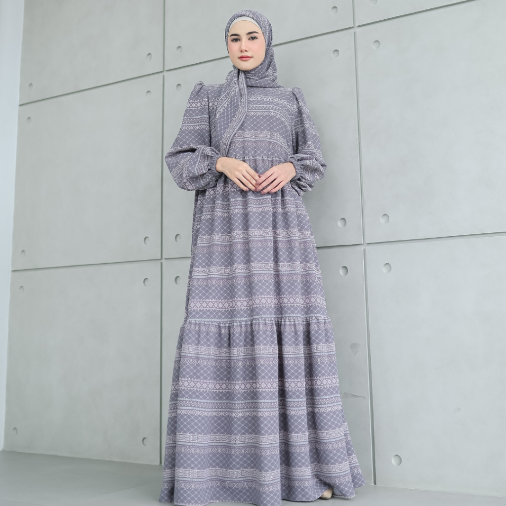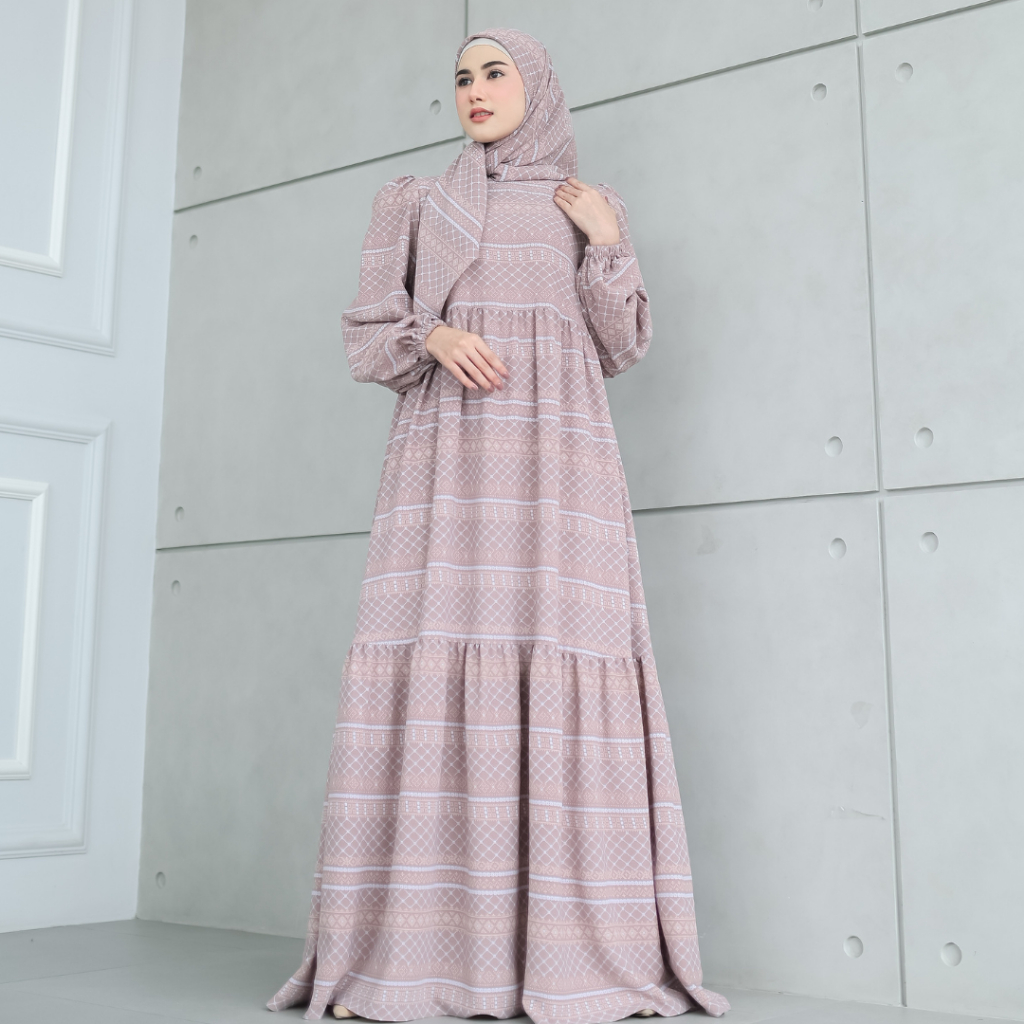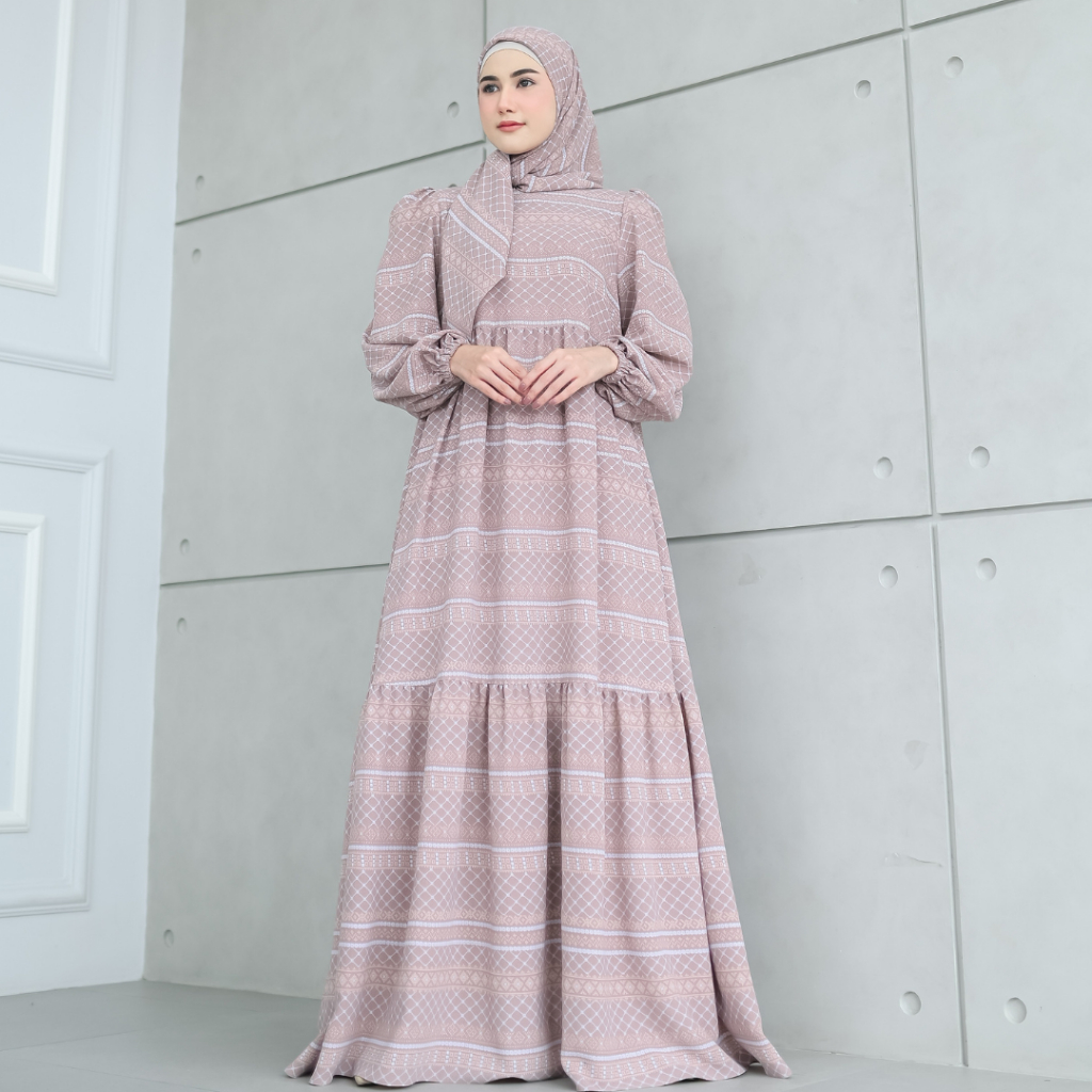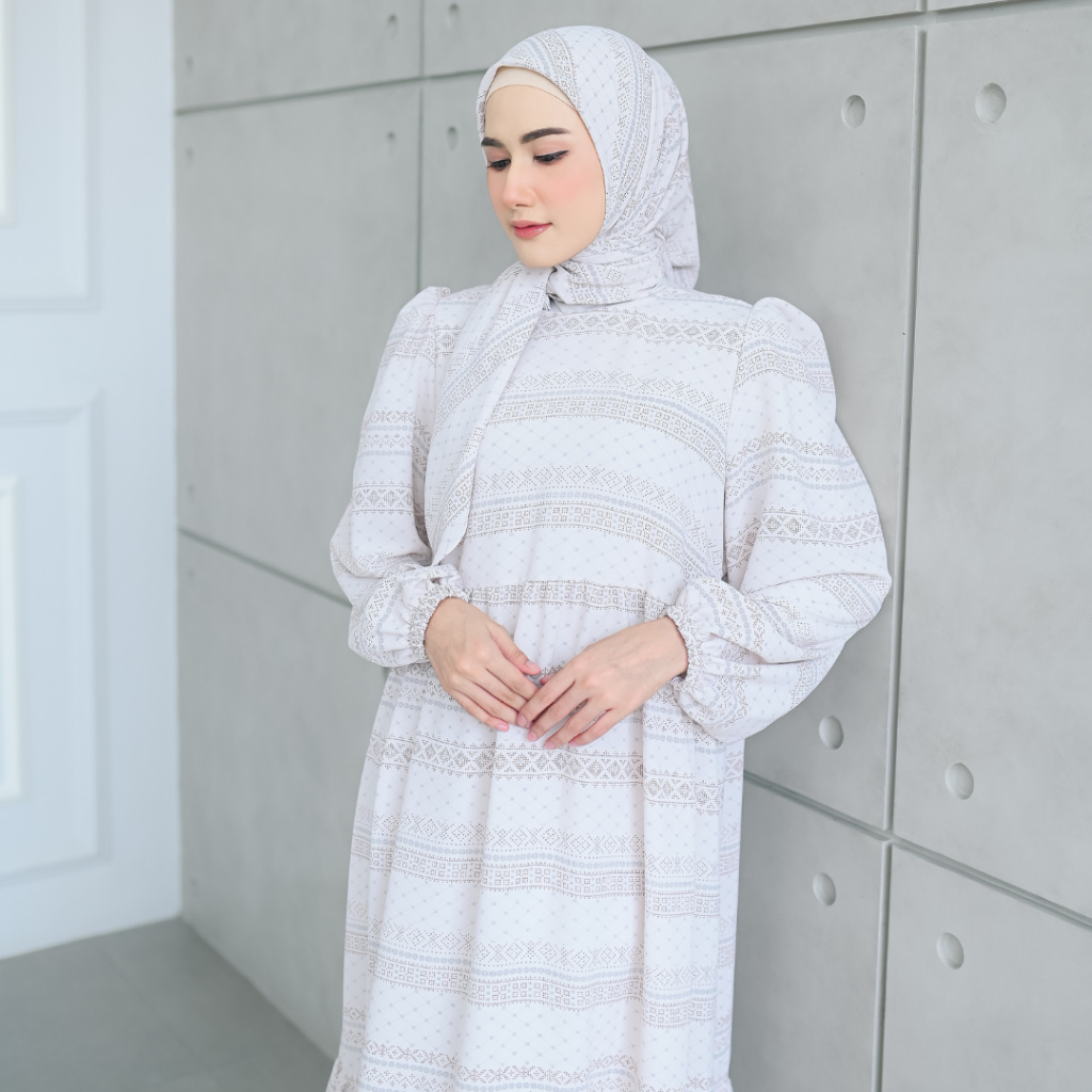 SHANUM SET SERIES PASHMINA SEGIEMPAT BAHAN BONITA DRESS GAMIS WANITA MOTIF TANGAN BALON KERUT BERUMPAK