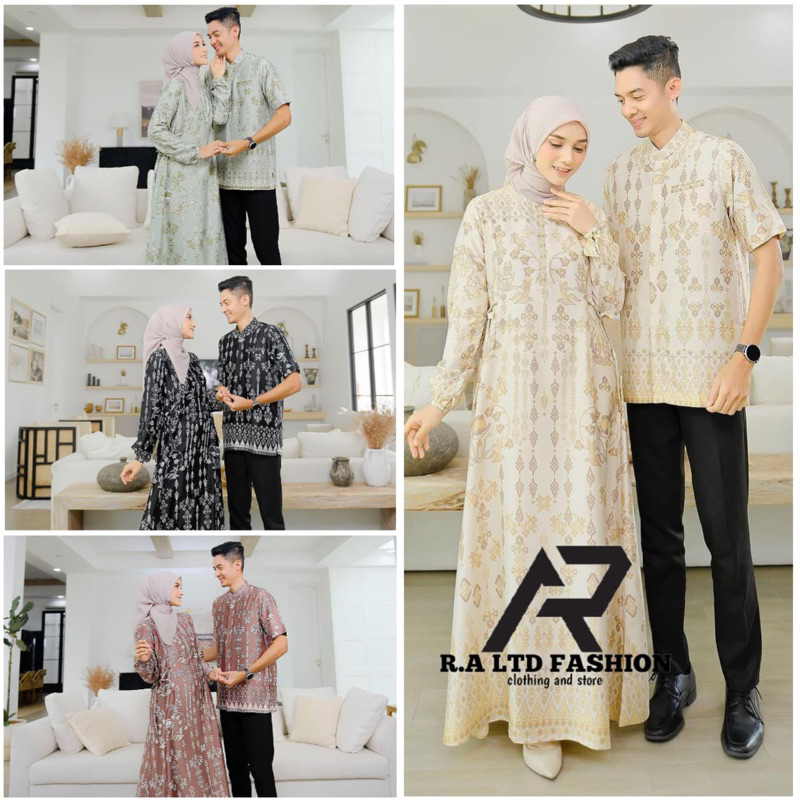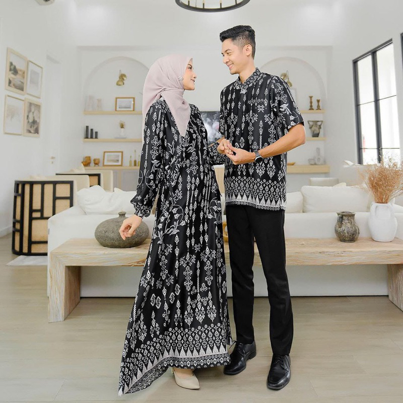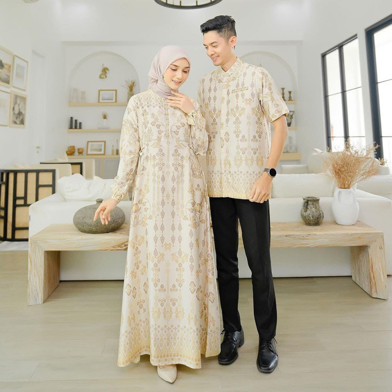 COUPLE BAJU MUSLIM PASANGAN GAMIS DAN KEMEJA PRIA LENGAN PENDEK KONDANGAN KEKINIAN SILKY MAXMARA DRESS