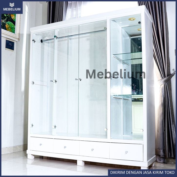 Lemari Pakaian Kaca Gamis Minimalis Modern / Lemari Baju Gantung 4 Pintu Kayu Bloktik Solid