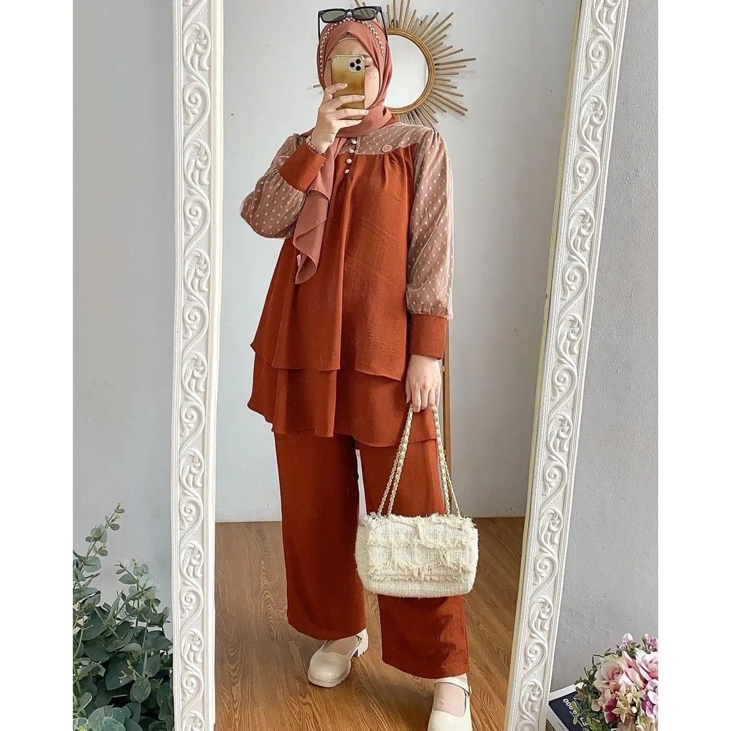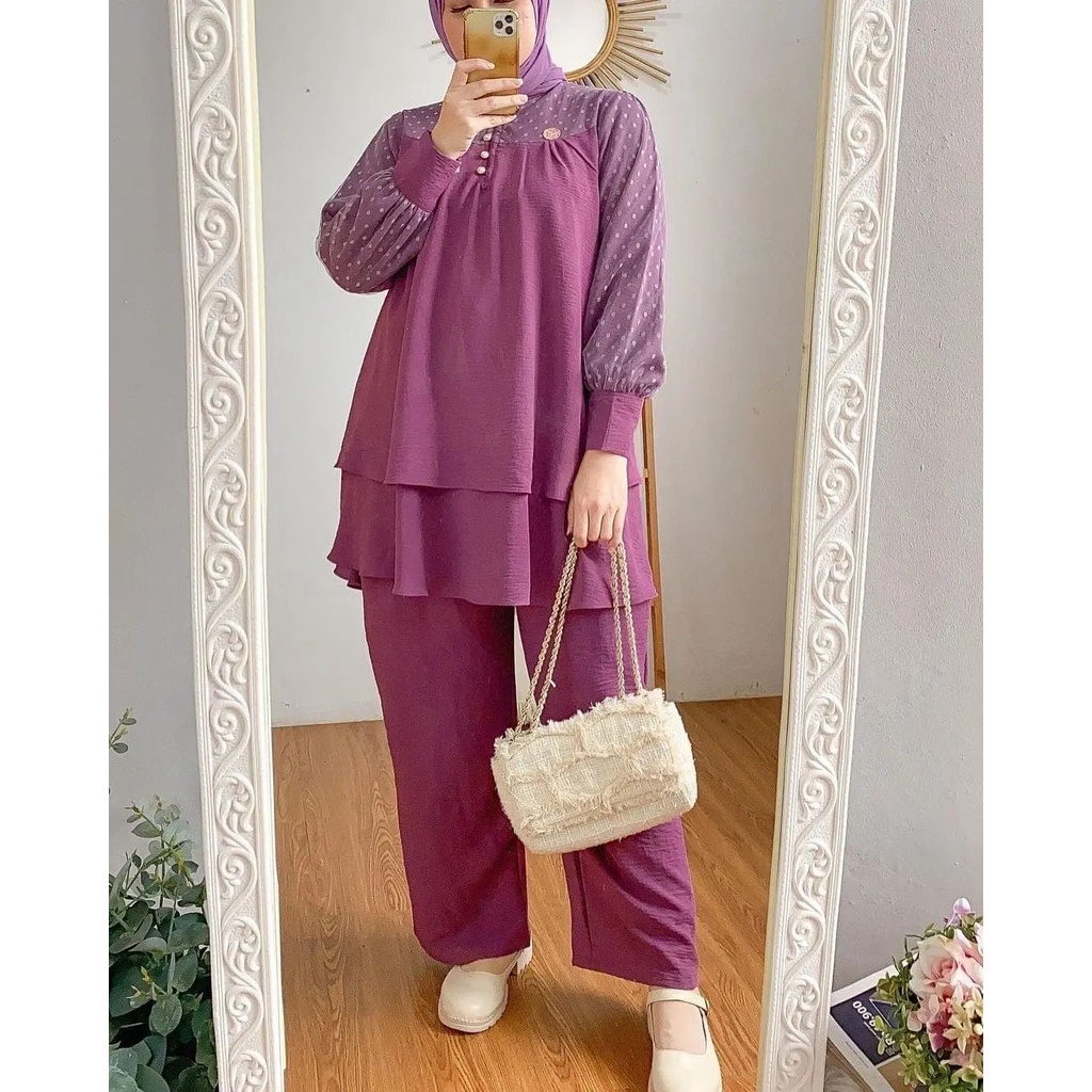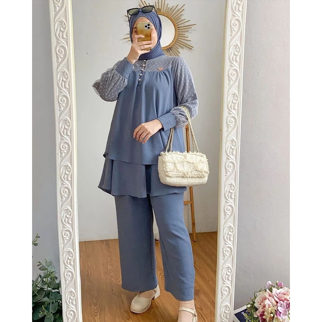 HANNA SET / SETELAN WANITA BAHAN CRINKLE MIX TILEDOT TERBARU / ATASAN + CELANA / FASHION KEKINIAN / MURAH / MF