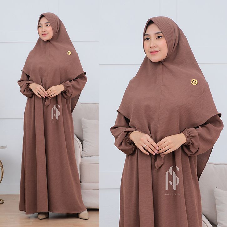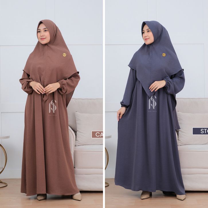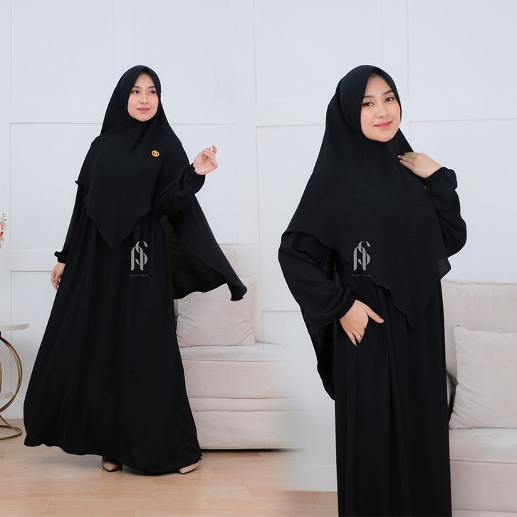 Gamis Set Hijab Syari Terbaru 2024 Bahan Crinkle Airflow Premium Baju Wanita Muslimah Polos Busui friendly by Nabil Ser