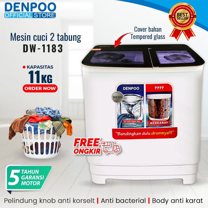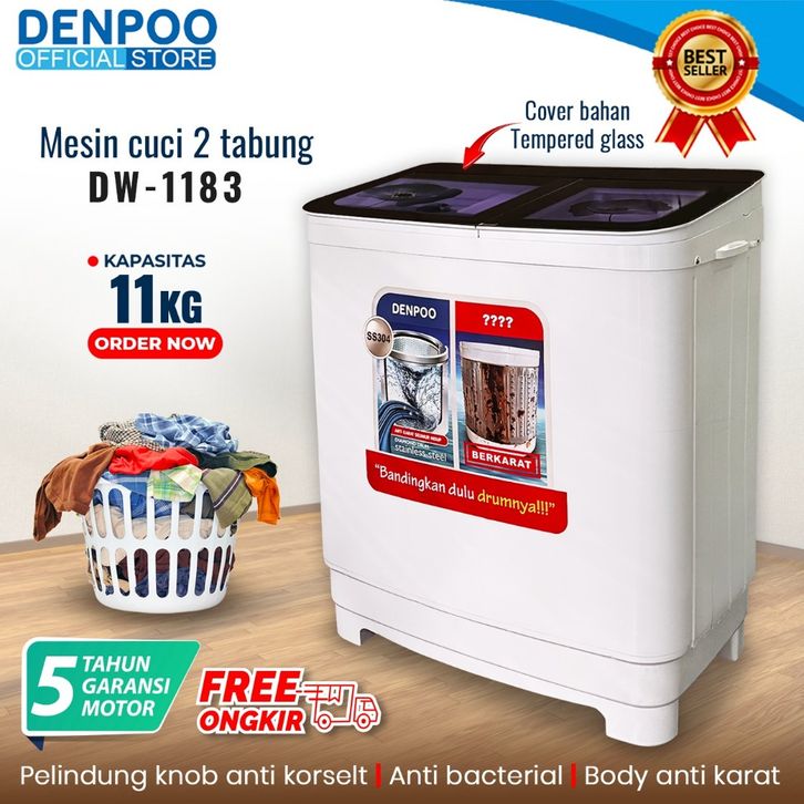 MESIN CUCI DENPOO DUA 2 TABUNG 11KG 11 KG DW 1183 SS304 DW1183 TWIN TUB BUKAAN ATAS MURAH