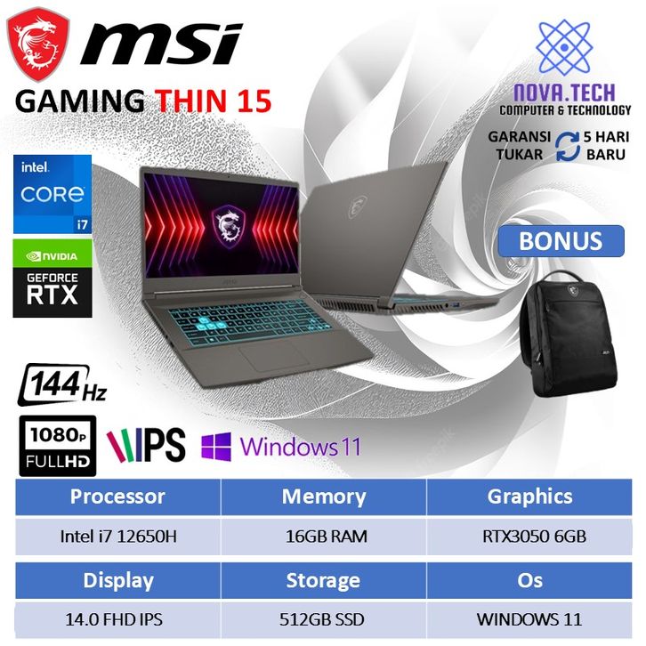 MSI Thin 15 B12UC Core i7 12650H RTX3050 4GB Ram 8GB 512GB Ssd W11 Layar 15.6FHD 144Hz Garansi Resmi