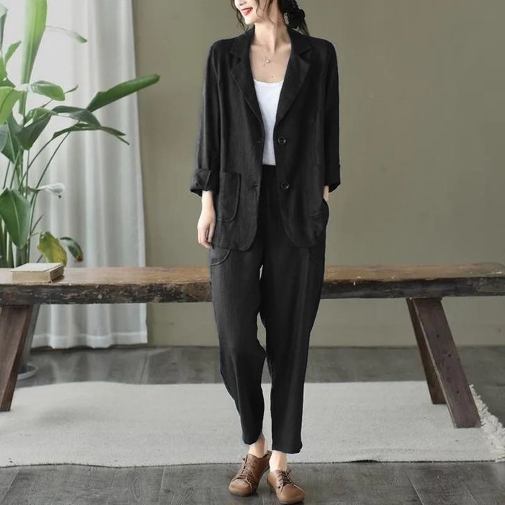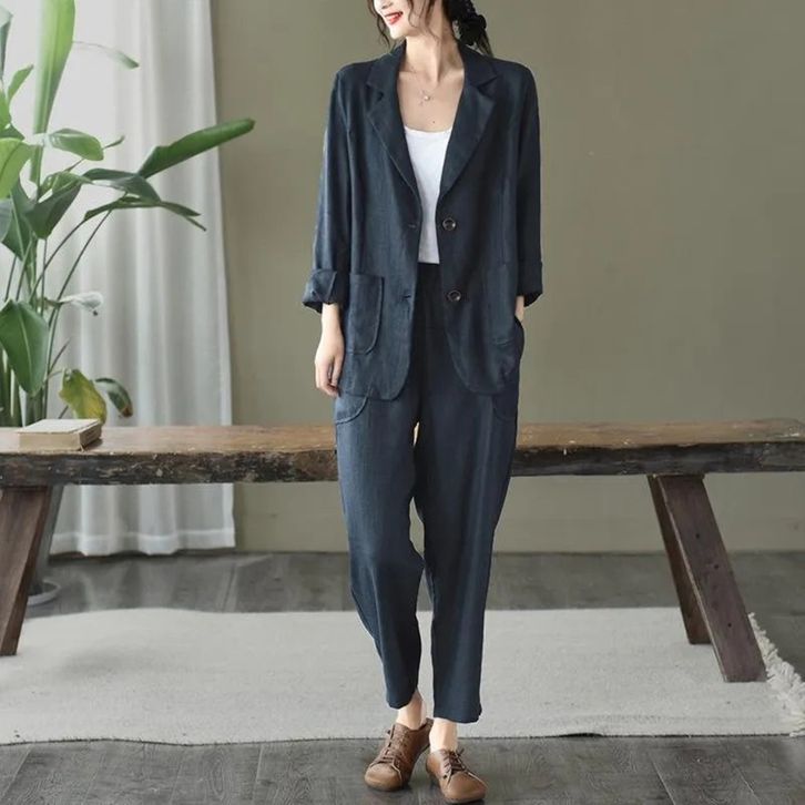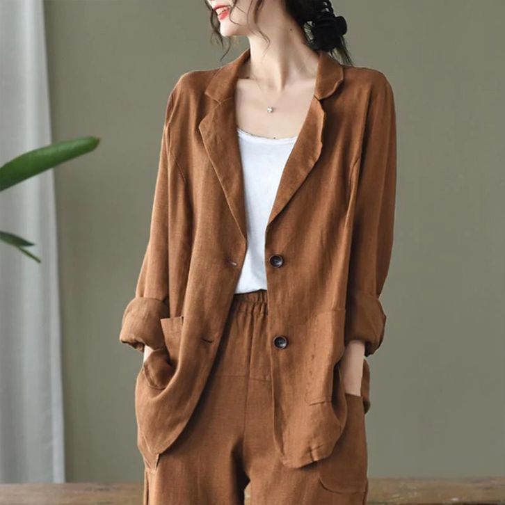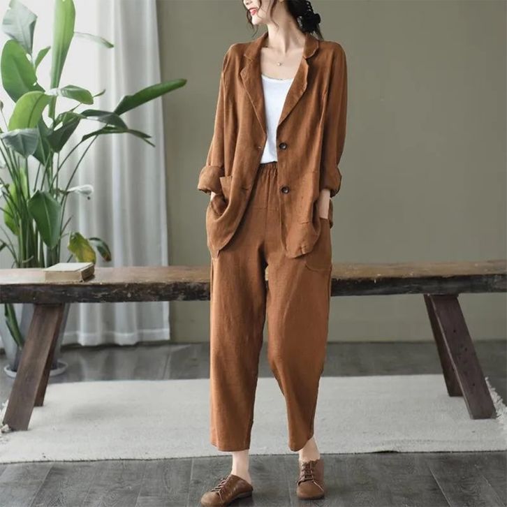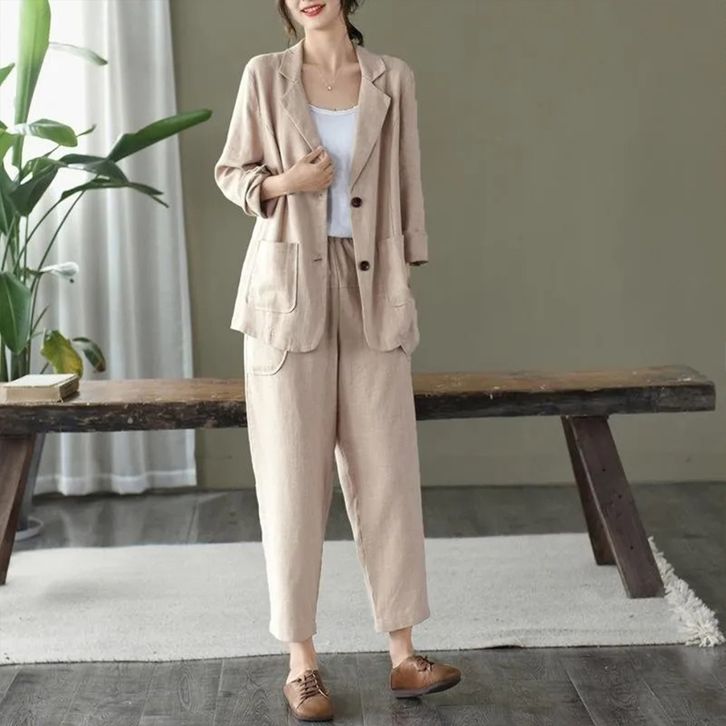 Setelan Blazer Wanita Trendi One Set Perempuan Celana Blezer Panjang Fashion Kerja Kantoran Kekinian Bahan Linen Rami