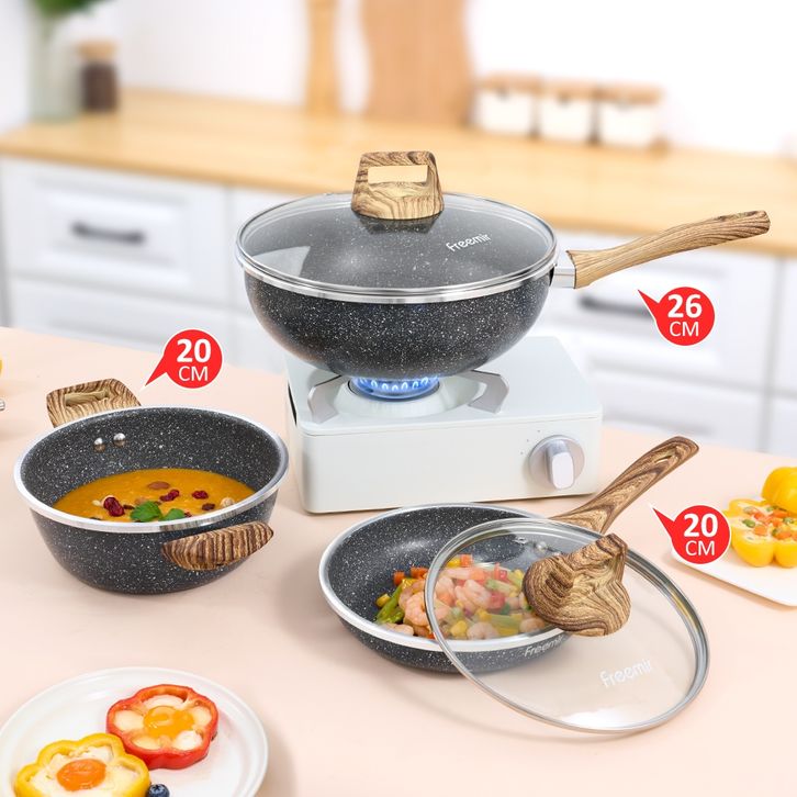 freemir Set 5 Pcs Wajan Panci Granit 26/20/20 Cm - Alat Masak Multifungsi dengan Lapisan Anti Lengket, Tutup Kaca, dan G