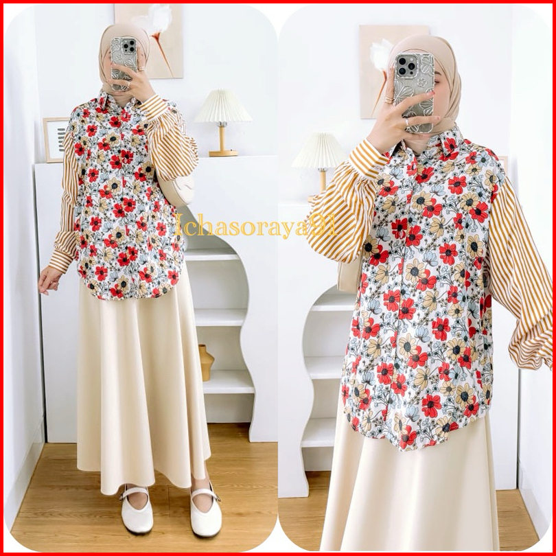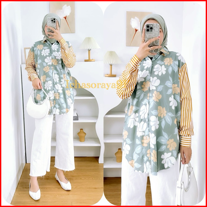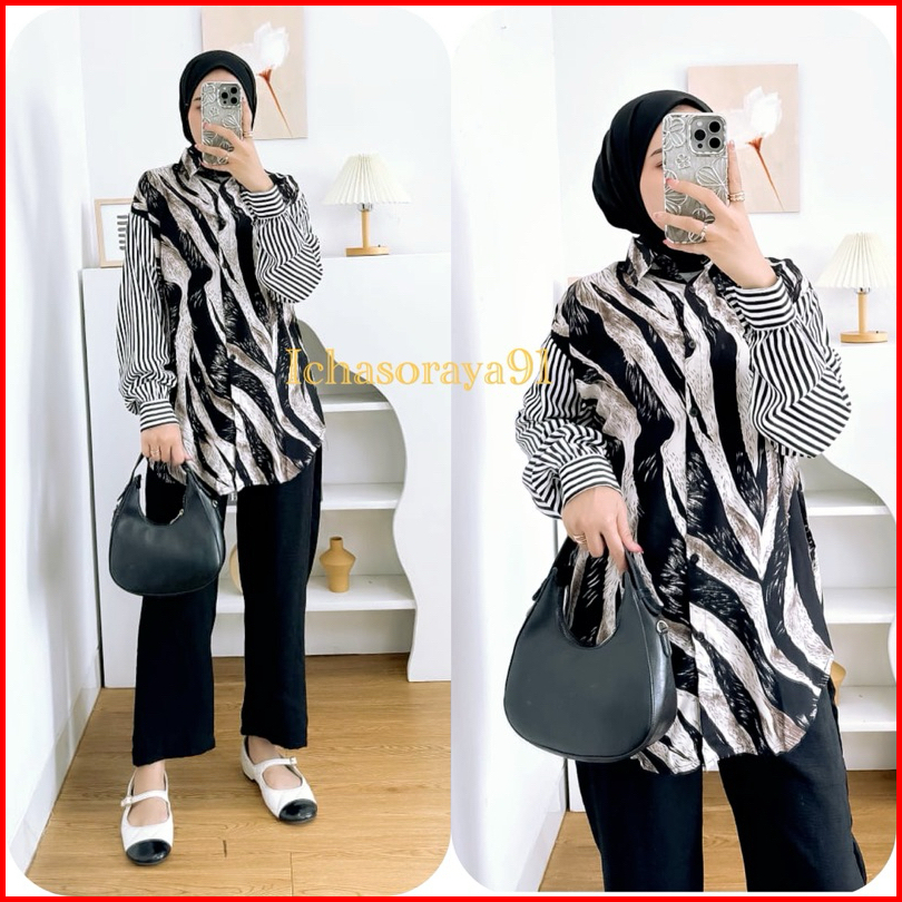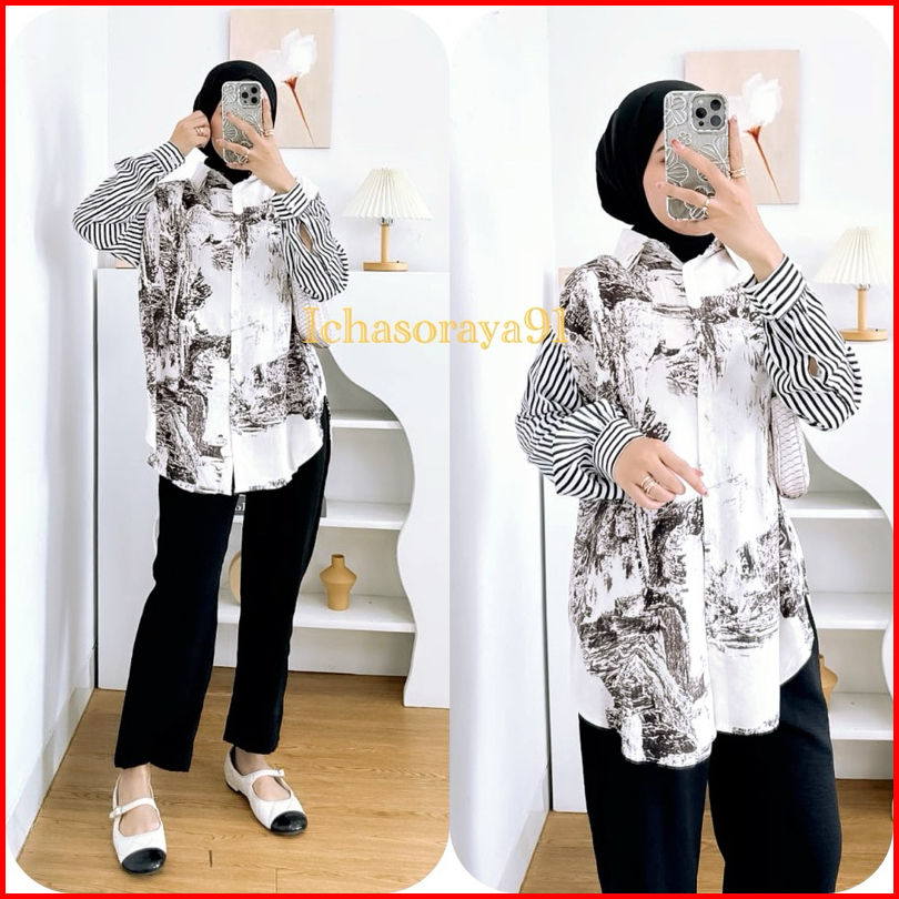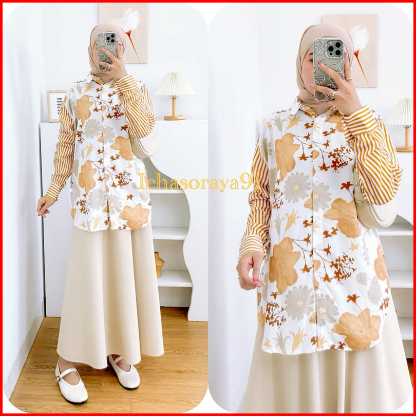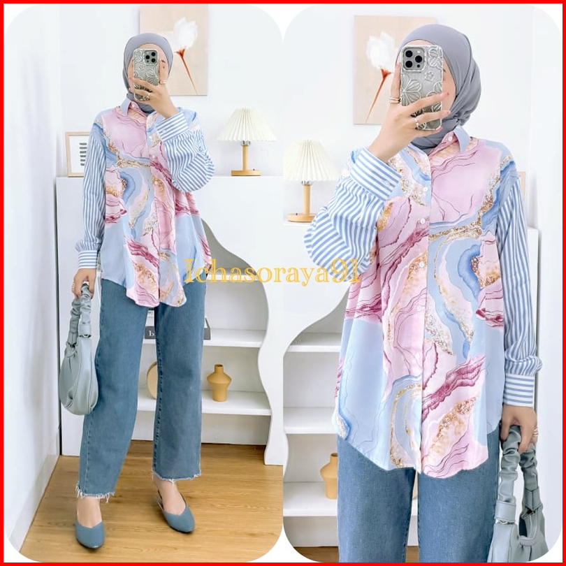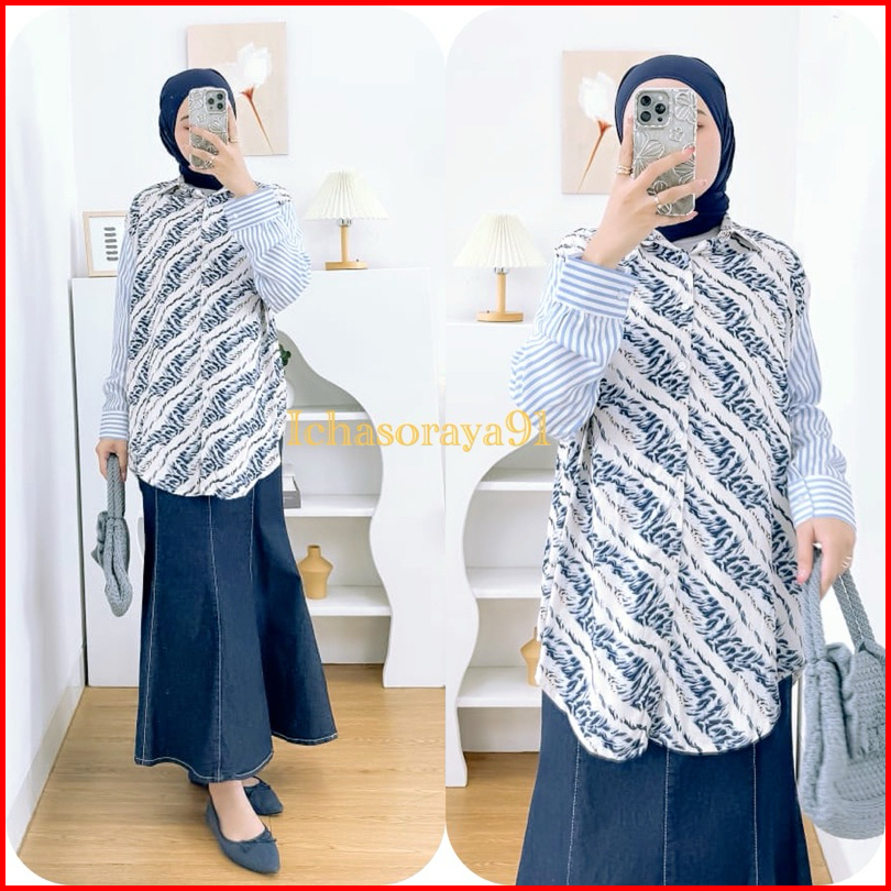 Kemeja Kombinasi Salur Bahan Raron Motif Viral Ld 120 Cm