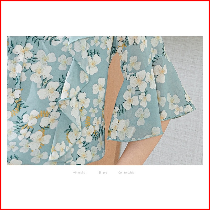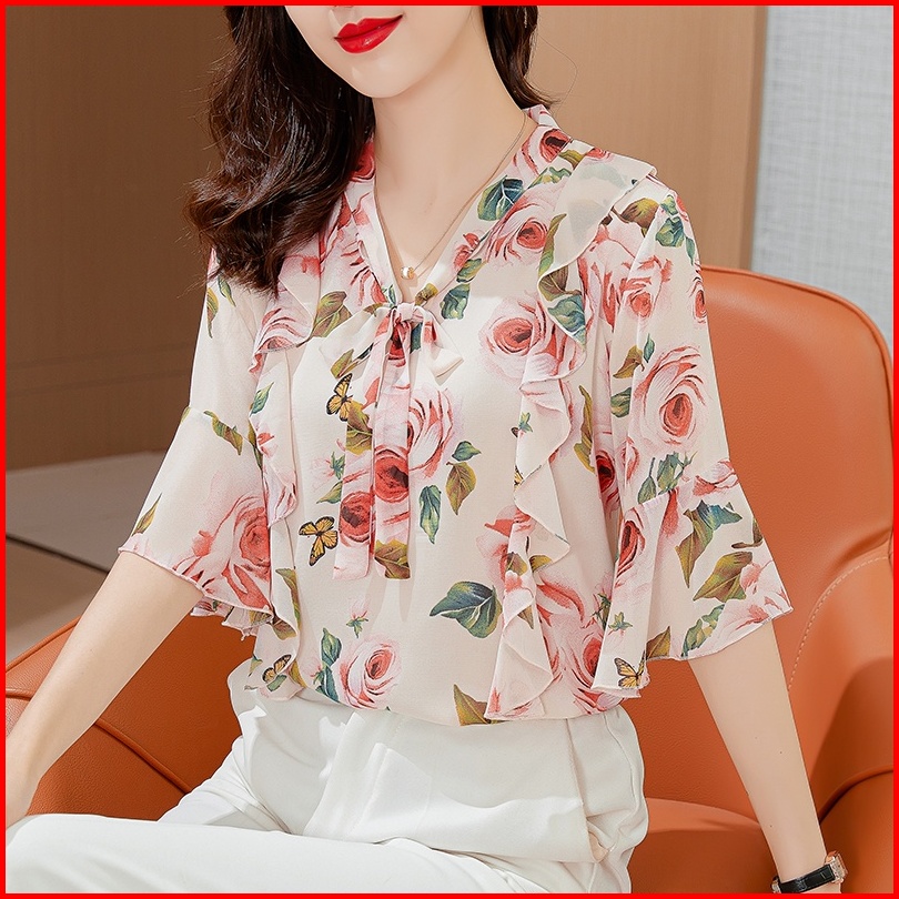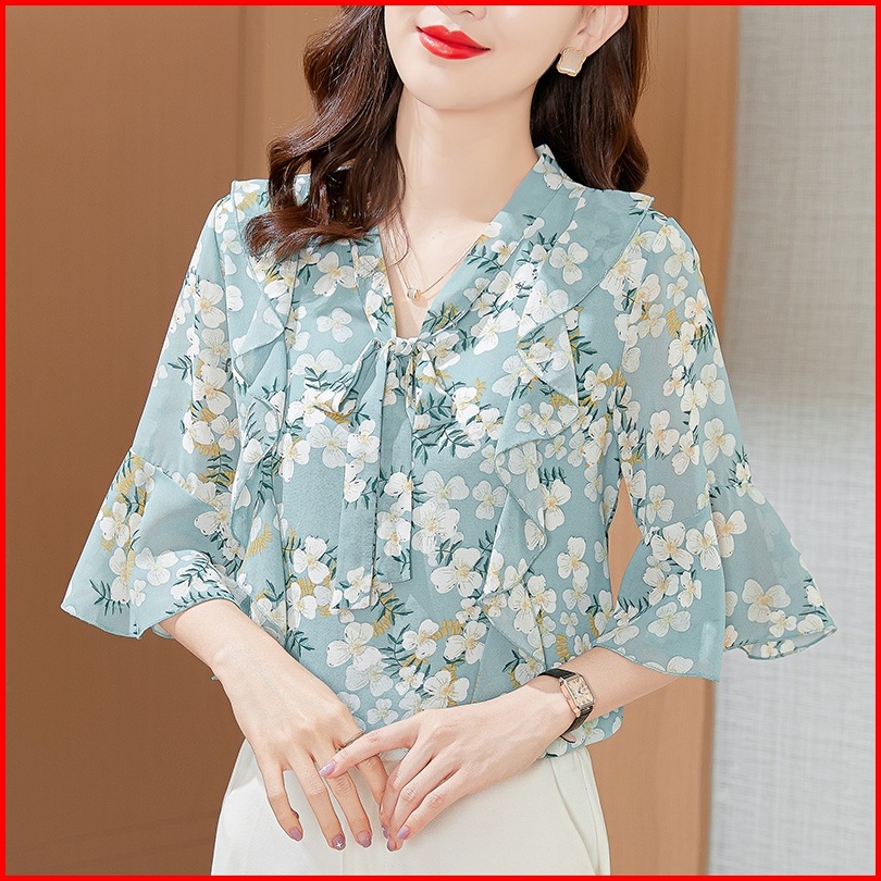 New 2022 Fashion Korean Chiffon Floral 3 4 Sleeve Shirts Pink Blue Women Blouse Tops Pakaian Serban