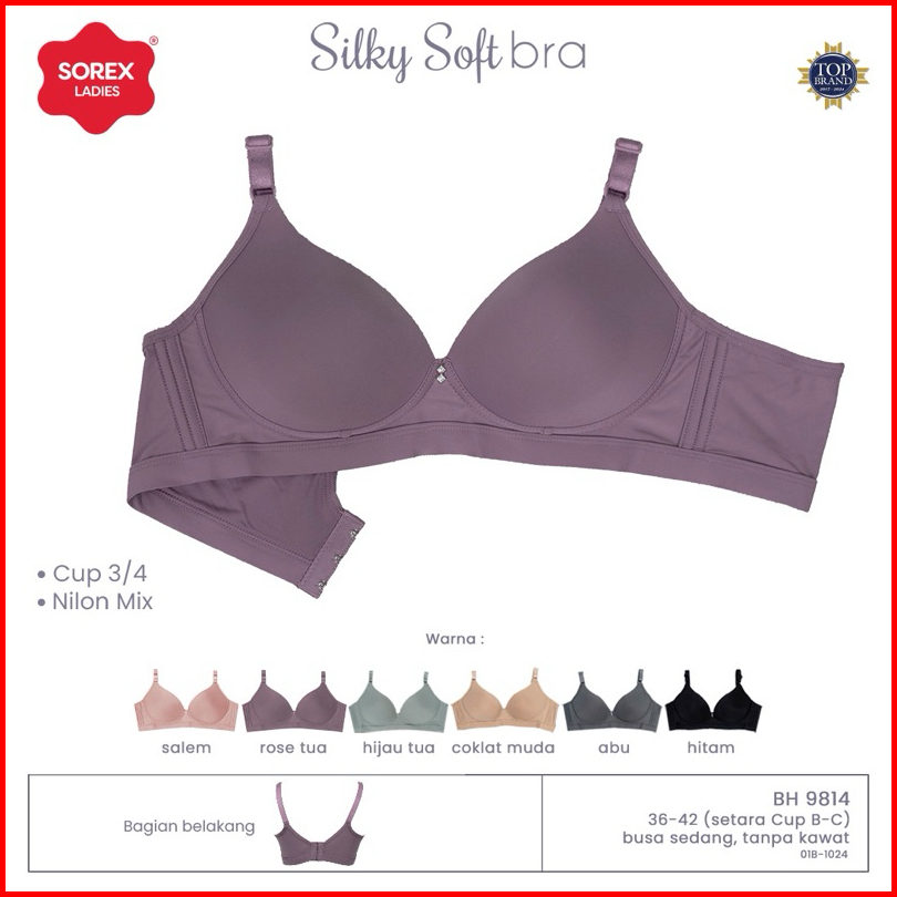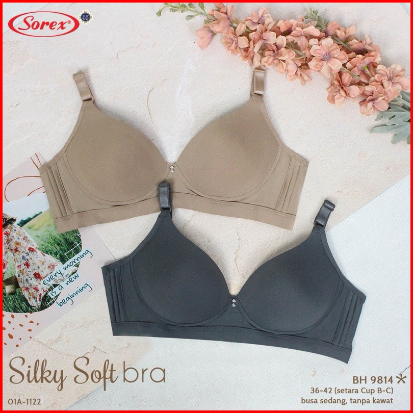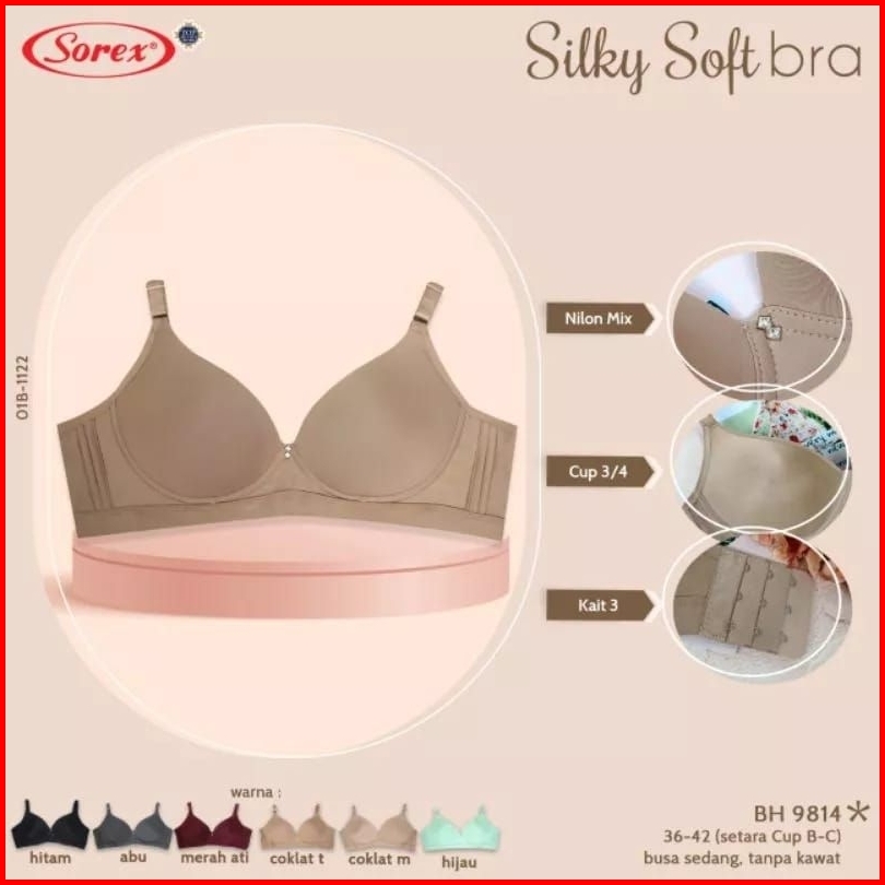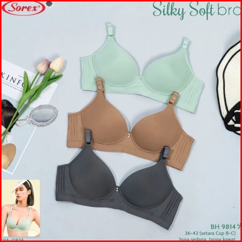 Bra Sorex 9814 Tanpa Kawat Busa Tipis Lembut Silky Soft Kait 3 Cup B-c