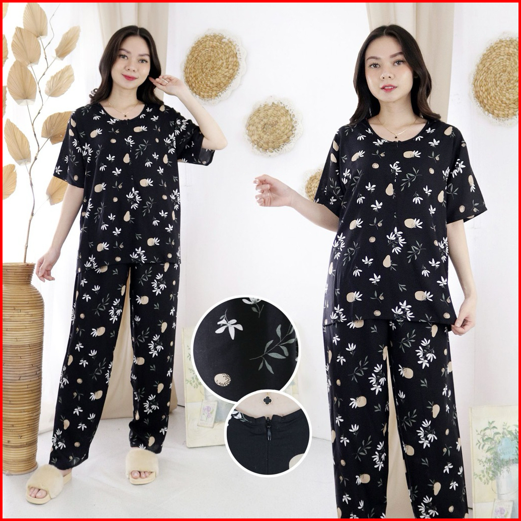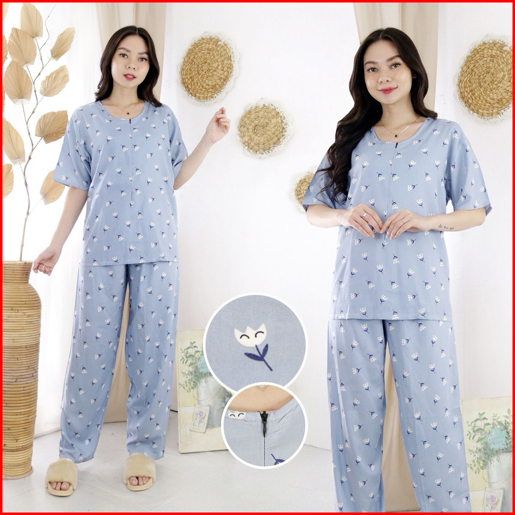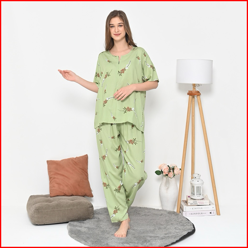 Oneset Piyama Rayon Setelan Celana Panjang Lengan Pendek Resleting