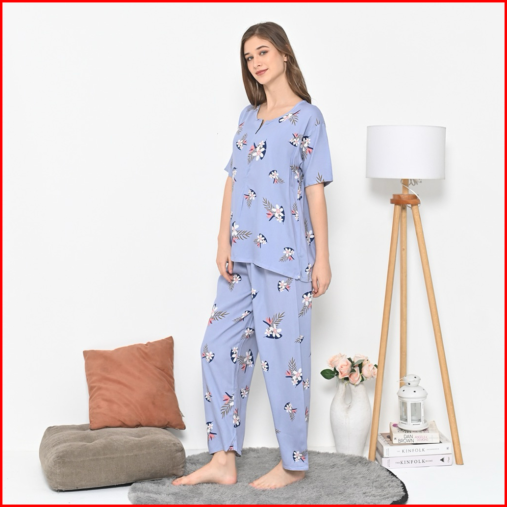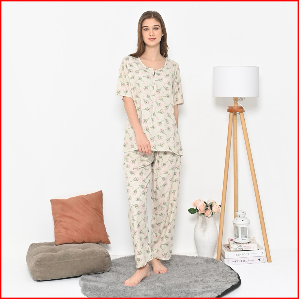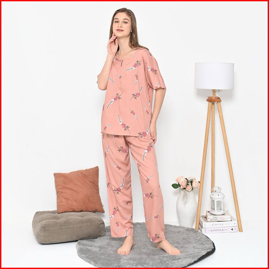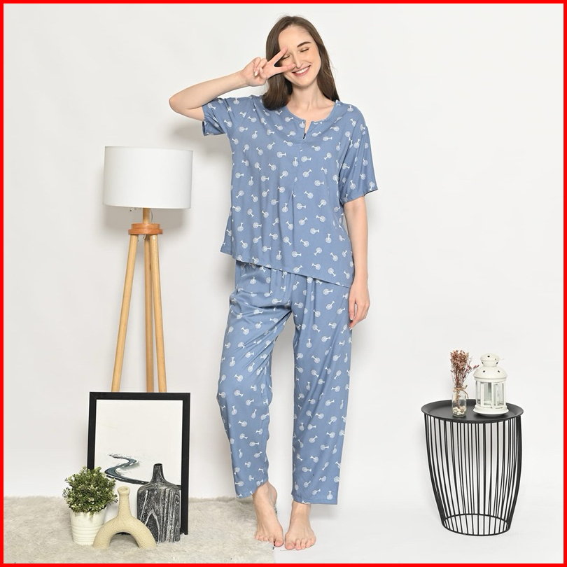 Oneset Piyama Rayon Setelan Celana Panjang Lengan Pendek Resleting